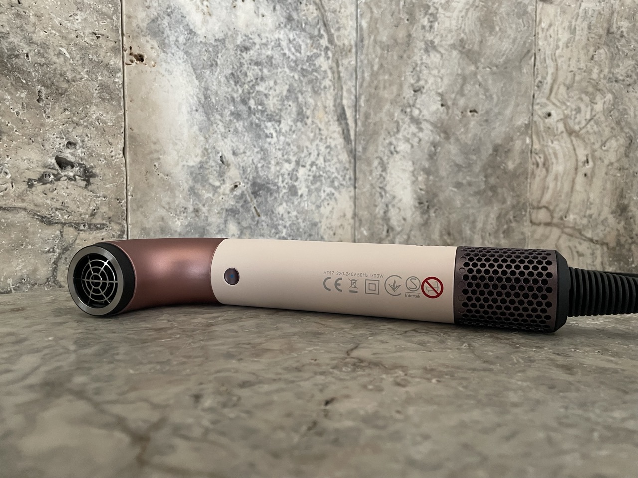 Der Dyson Supersonic r macht direkt beim Auspacken einen sehr hochwertigen Eindruck. Der Kunststoff wirkt robust und langlebig – nichts wackelt, nichts wirkt billig. Besonders beeindruckend ist die Hitzebeständigkeit: Auch bei längerer Nutzung bleibt das Gehäuse angenehm kühl. Scharfe Kanten oder sichtbare Mängel entdecken wir nicht, alles ist rundum sauber verarbeitet. Das verleiht dem Gerät nicht nur ein edles Aussehen, sondern auch Vertrauen in seine Alltagstauglichkeit. Uns sagt die Farbgebung ceramic pink/roségold zu.