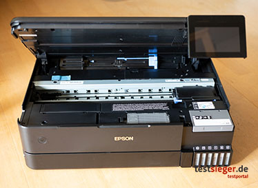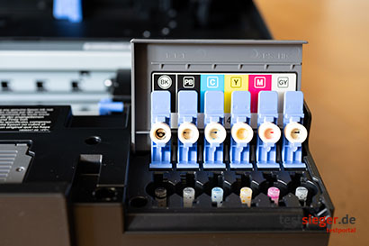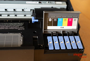 Die Inbetriebnahme ist aufgrund der Schritt-für-Schritt-Anleitung trotz der Komplexität des Druckers vergleichsweise einfach. Sowohl das kleine Handbuch als auch die umfangreiche Online-Anleitung auf der Hersteller-Website führen mustergültig durch die Erstinstallation. Selbst das Befüllen der Tintentanks ist kinderleicht. Es tropft und kleckert nichts daneben. Dazu klappen Nutzerinnen und Nutzer mithilfe der seitlichen Einkerbungen den Scanner nach oben. Danach ist der Weg zu den Tintentanks auf der linken Vorderseite frei. Dann die graue Abdeckung sowie den Verschluss der einzelnen Tintentanks öffnen. Anschließend die gut sichtbar markierten Tintentanks bis zur obersten Markierung befüllen – fertig. Doch Vorsicht: Die Flasche nicht verkanten oder schräg ansetzen, sonst kann Tinte austreten.