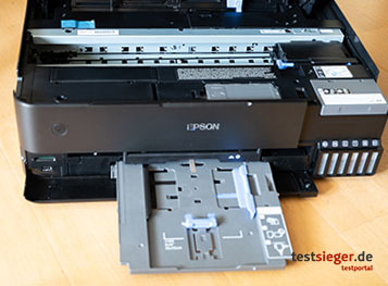 Erstaunlich ist auch, dass wir unsere Testseiten in A3 sehr zügig in den Händen halten. Der zeitliche Mehraufwand ist nicht exorbitant groß. Die Qualität ist auch in Ordnung. Die A3-Seiten können dabei ausschließlich in den hinteren Papiereinzug gelegt werden, der variabel einstellbar ist. Für Fotoausdrucke nutzen wir hingegen entweder die komplett herausziehbare Kassette für die klassischen Formate wie 10 x 15 oder 13 x 18 Zentimeter oder aber die ebenfalls herausziehbare Kassette für Formate bis DIN-A4. Äußerst praktisch ist zudem, dass der Drucker Bastelkarton oder gar bis zu zwei Meter lange Seiten über den hinteren Einzug aufnehmen und bedrucken kann, sofern diese dem maximalen A3-Format in der Breite entsprechen. So sind auch Collagen oder Ähnliches druckbar, was mit einem normalen Drucker nicht möglich ist.