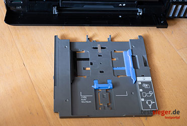Unsere ausgedruckten Testseiten nehmen wir oberhalb der Papierkassette wieder entgegen. Sehr praktisch ist, dass sich die Auslage automatisch anpasst und auch vor dem Druck herausfährt. Dort finden die Ausdrucke ausreichend Platz. Dabei wird jedoch auch ein kleiner Makel dieser Konstruktion sichtbar: Möchten wir während der Nutzung Papier für den Fotodruck nachfüllen, müssen wir entweder umständlich das Papier unter der Papierauslage in die Papierkassette unterbringen oder aber wir drücken auf dem Display rechts unten die Taste Ausgabe und der Einzug fährt automatisch ein. Wer das allerdings nicht weiß, steht mitunter vor teils unüberwindbaren Handhabungsproblemen. Hier hätten wir uns eine etwas praktischere Lösung gewünscht.