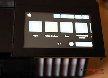 Die Bedienung erfolgt sowohl über das LC-Touch-Display am Gerät als auch über die Software Epson Photo+, Epson ScanSmart oder Epson ScanUtility. Per Smartphone greifen Nutzerinnen und Nutzer über die Apps Epson iPrint und Epson Smart Panel auf die einzelnen Funktionen zu, sofern der Drucker in das heimische Drahtlosnetzwerk eingebunden ist. Das funktioniert in unserem Test hervorragend und sehr zuverlässig. Praktisch: PC oder Laptop müssen nicht unbedingt eingeschaltet sein, um etwas zu drucken oder zu kopieren. Das Touch-Display ist ausreichend groß, spricht gut auf Berührungen an und bietet einen guten Überblick zu den Funktionen des Druckers. Ein bisschen schade ist, dass der Sichtwinkel doch etwas beschränkt ist. Je mehr wir von der Frontalansicht abweichen, desto mehr verschwimmt die Schrift. Abhilfe schafft die Klappfunktion um gut 90 Grad nach oben. Auch die smarten Funktionen der Epson-Smart-Panel-App überzeugen uns im Test. Sie bieten einen echten Mehrwehrt für die Anwenderinnen und Anwender.