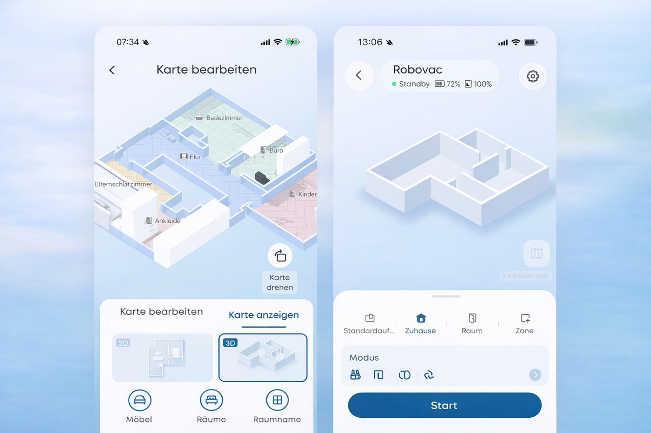 Funktional bringt die App einiges mit. No-Go-Zonen lassen sich frei einzeichnen, für jeden Raum kann individuell gewählt werden, ob gesaugt, gewischt oder beides erledigt werden soll. Reinigungspläne legen fest, wann und wie häufig der Roboter aktiv wird, und eine Memory-Funktion sorgt dafür, dass er nach dem Aufladen dort weitermacht, wo er aufgehört hat. Dazu kommt ein KI-Assistent, der auf Basis von Raumtyp und Bodenbelag passende Einstellungen vorschlägt – das wirkt durchdacht.