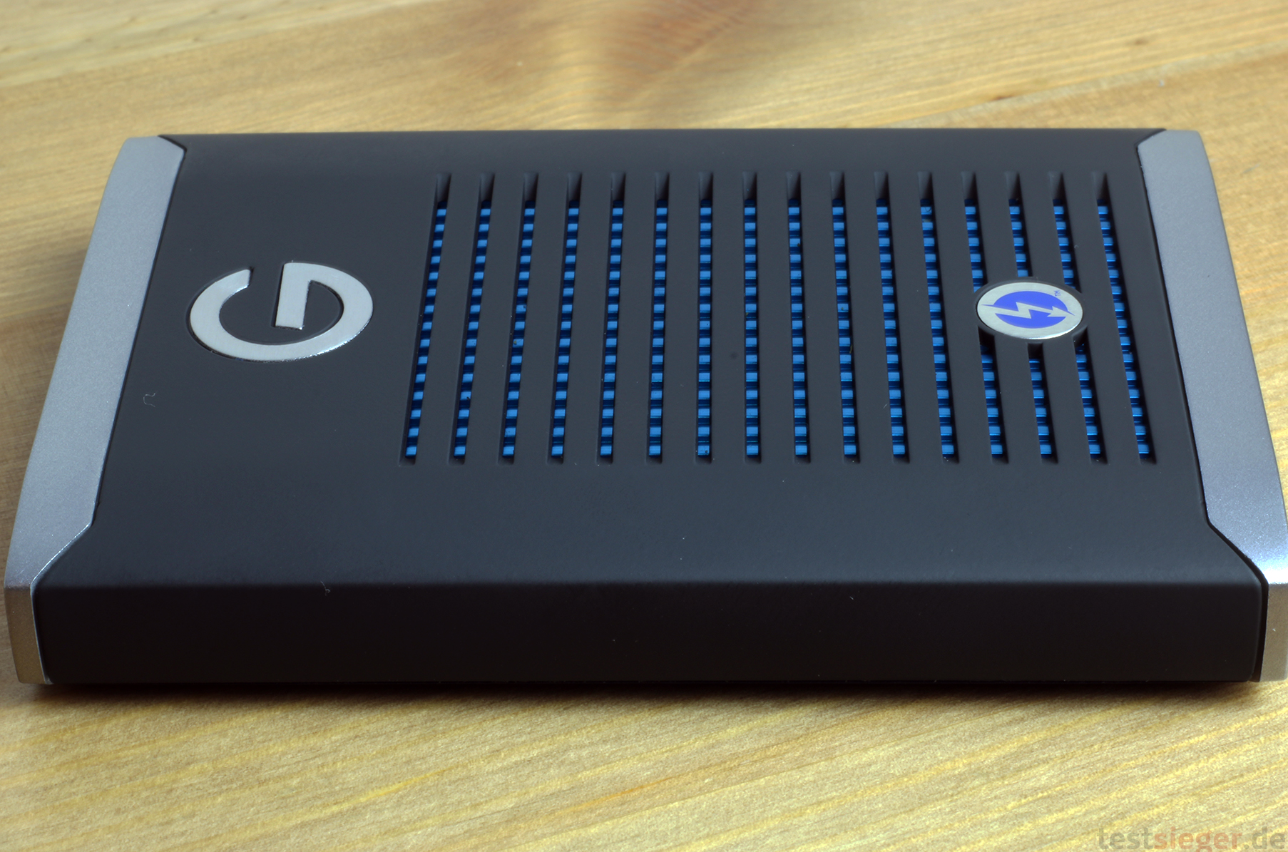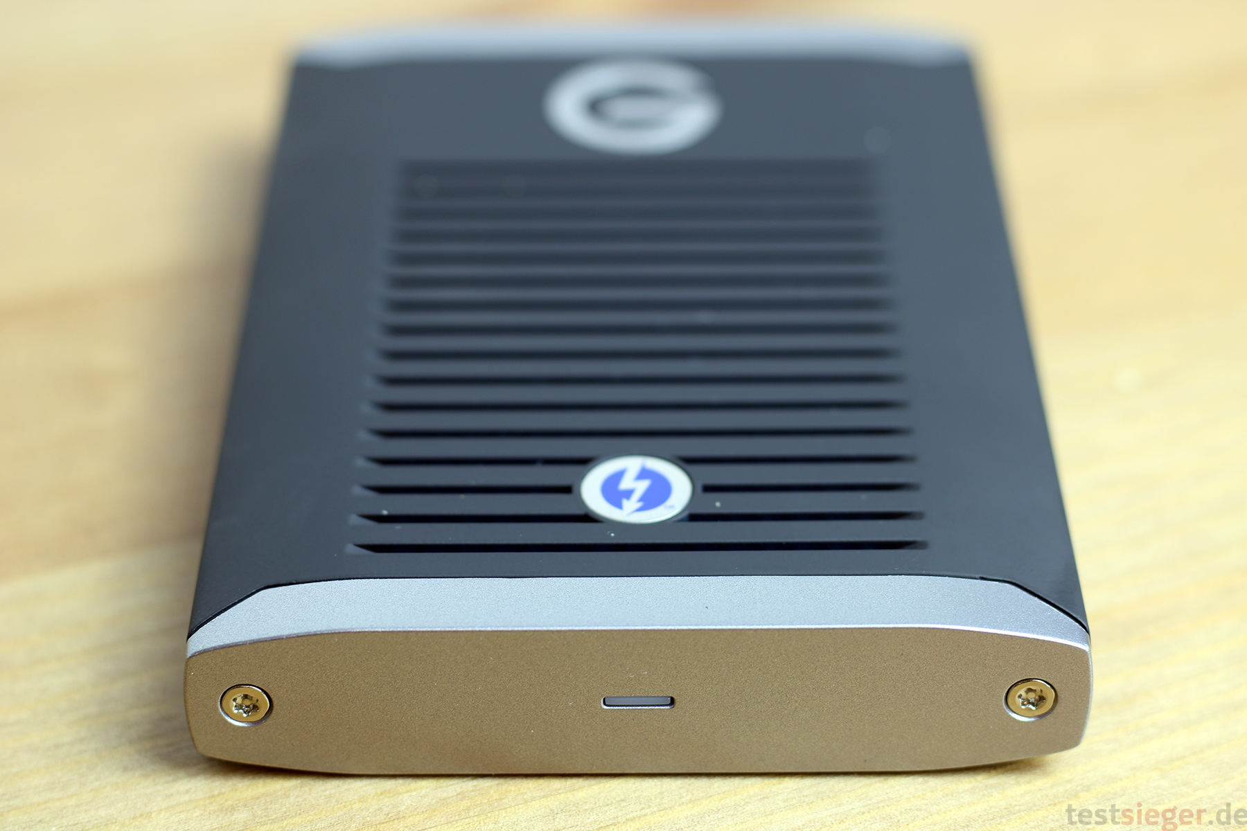 Da es sich um eine 2,5-Zoll-Festplatte handelt, wird keine externe Stromquelle benötigt. Die Energie kommt vom PC-System und wird über den Thunderbolt-Anschluss zur Festplatte übertragen. Der Nachteil: Die Festplatte saugt am Notebook-Akku und dieser geht schneller zur Neige.