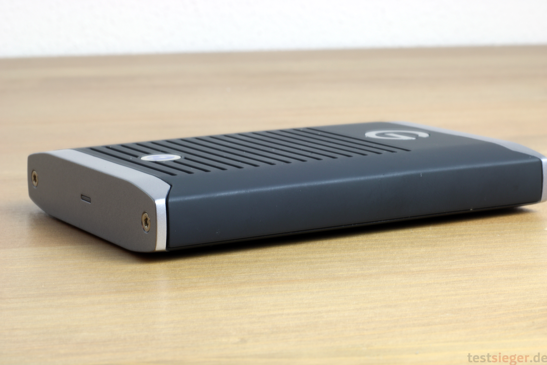Die verschiedenen Komponenten sind fest und sauber miteinander verbunden. Zudem schützt das Gehäuse das sensible Innenleben. Unsere herkömmlichen Falltests aus ein bis zwei Metern Höhe meistert die G-Drive problemlos. Wir gehen sogar noch einen Meter nach ob, doch auch hier stellen wir keine Beschädigungen fest. Mit einer Tiefe von 11,2 Zentimeter, einer Höhe von 1,6 Zentimetern und einer Breite von 7,9 Zentimetern ist die SSD gerade in Anbetracht der hohen Leistungsdaten angenehm kompakt ausgefallen. Das Gewicht ist mit knapp einem Kilogramm aber deutlich spürbar.