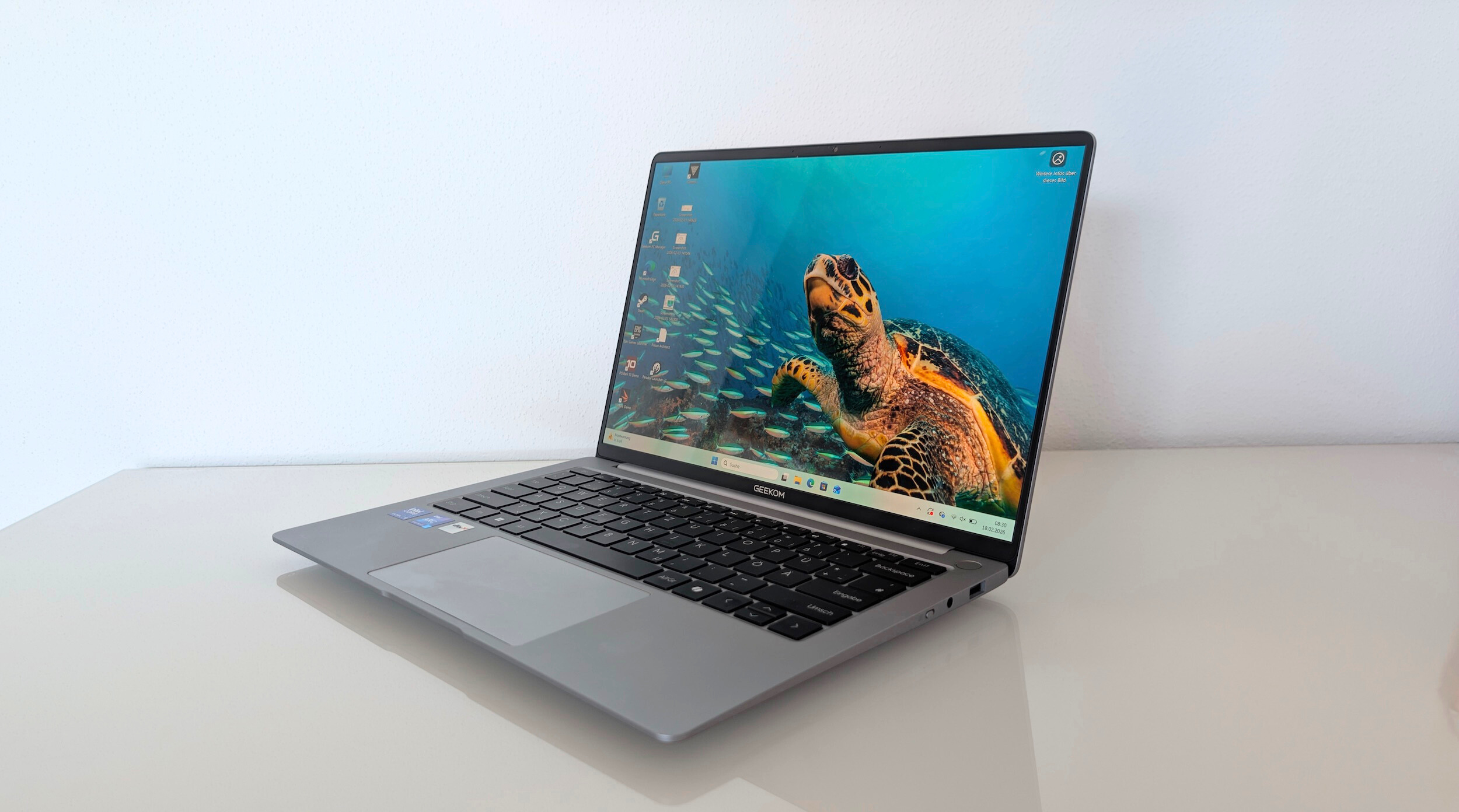 Das Geekom GeekBook X14 Pro verbindet starke Produktivleistung mit einem sehr scharfen OLED-Display und einer insgesamt hochwertigen Anmutung. Besonders im Alltag überzeugen die flüssige Bedienung, das angenehme Tippgefühl, das präzise Touchpad und die sehr schnellen Startzeiten. Die Anschlussauswahl ist praxisnah, und der beigelegte Hub kompensiert den fehlenden LAN-Port sinnvoll. Gleichzeitig zeigt das Gerät klare Grenzen: Der dünne Displaydeckel wirkt wenig verwindungssteif, unter Last wird das Notebook mit bis zu 55 Dezibel deutlich laut, und Gaming bleibt trotz moderner Grafikfeatures nur eingeschränkt möglich. Wer ein kompaktes Arbeitsgerät mit viel Leistung und starkem Bildschirm sucht, findet hier ein attraktives Gesamtpaket, sollte aber die fehlende Aufrüstbarkeit und die spiegelnde Displayoberfläche in die Kaufentscheidung einbeziehen.