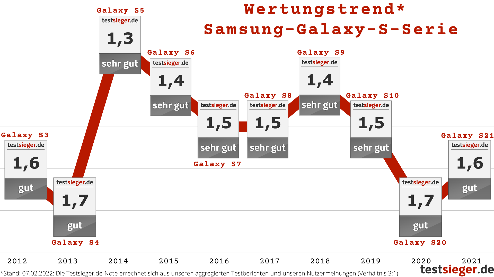 Die Stiftung Warentest vergibt in Ausgabe 07/2021 eine gute Wertung von 1,8 und lobt ebenfalls das sehr gute Display. Aber auch die Kamera und die Handhabung überzeugen. Obwohl sich die Akkulaufzeit deutlich verbessert, vergibt das Verbrauchermagazin hier trotzdem nur eine befriedigende Teilnote von 3,3. Bei unserer aggregierten Wertung schneidet das S21 minimal besser als der Vorgänger ab und erhält eine 1,6.
