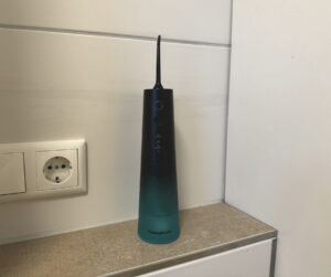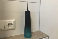 Auch mit nassen Fingern bleibt die Munddusche sicher in der Hand. Das Material der Oberfläche sorgt für ausreichend Grip und verhindert ein Abrutschen. Die Ergonomie des Griffs ist gelungen, auch wenn bei schwer erreichbaren Stellen im Mund eine noch etwas ergonomischere Form wünschenswert wäre. Insgesamt bietet das Gerät aber eine sehr komfortable Nutzung.