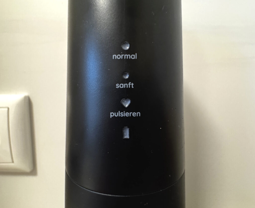 Es stehen 3 verschiedene Druckstufen zur Auswahl: ein normaler Reinigungsmodus, ein sanfter Modus für empfindliches Zahnfleisch sowie ein pulsierender Modus zur Massage. Während der normale Modus recht kräftig ausfällt – fast zu stark für empfindlichere Nutzerinnen und Nutzer – bietet der sensitive Modus eine angenehme Alternative.