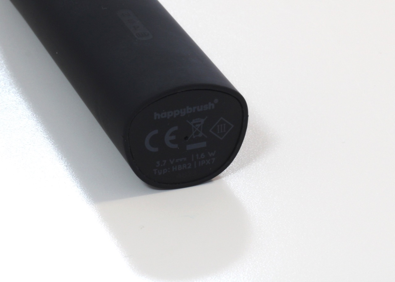 Die happybrush ECO R2 all black überzeugt durch ein ansprechendes, modernes Design. Abgerundete Formen und klare Linien bestimmen die Optik. Wie der Name nicht anders vermuten lässt, sind das Gehäuse und die Aufsteckbürsten in verschiedenen Schwarztönen gehalten. Insgesamt präsentiert sich die Zahnbürste als hochwertiges Produkt, das problemlos mit etablierten Marken mithalten kann. Allerdings zeigt die matte Oberfläche eine gewisse Empfindlichkeit gegenüber Fingerabdrücken und leichten Kratzern.Hergestellt aus robustem Kunststoff, punktet die Zahnbürste durch eine sehr gute Verarbeitung. Da das Handstück aus einem Guss gefertigt ist, gibt es keine Spalten, in denen sich Schmutz oder Staub ansammeln könnte. Die verwendeten Materialien machen das Gerät widerstandsfähig gegen Stürze auf harten Oberflächen. Die Starttaste ist nahtlos ins Gehäuse integriert und ragt nicht hervor, was zur eleganten Erscheinung beiträgt. Laut happybrush besteht das Gehäuse aus 100 Prozent recyceltem Material, wodurch sie sich den Eco-Zusatz im Titel verdient.
