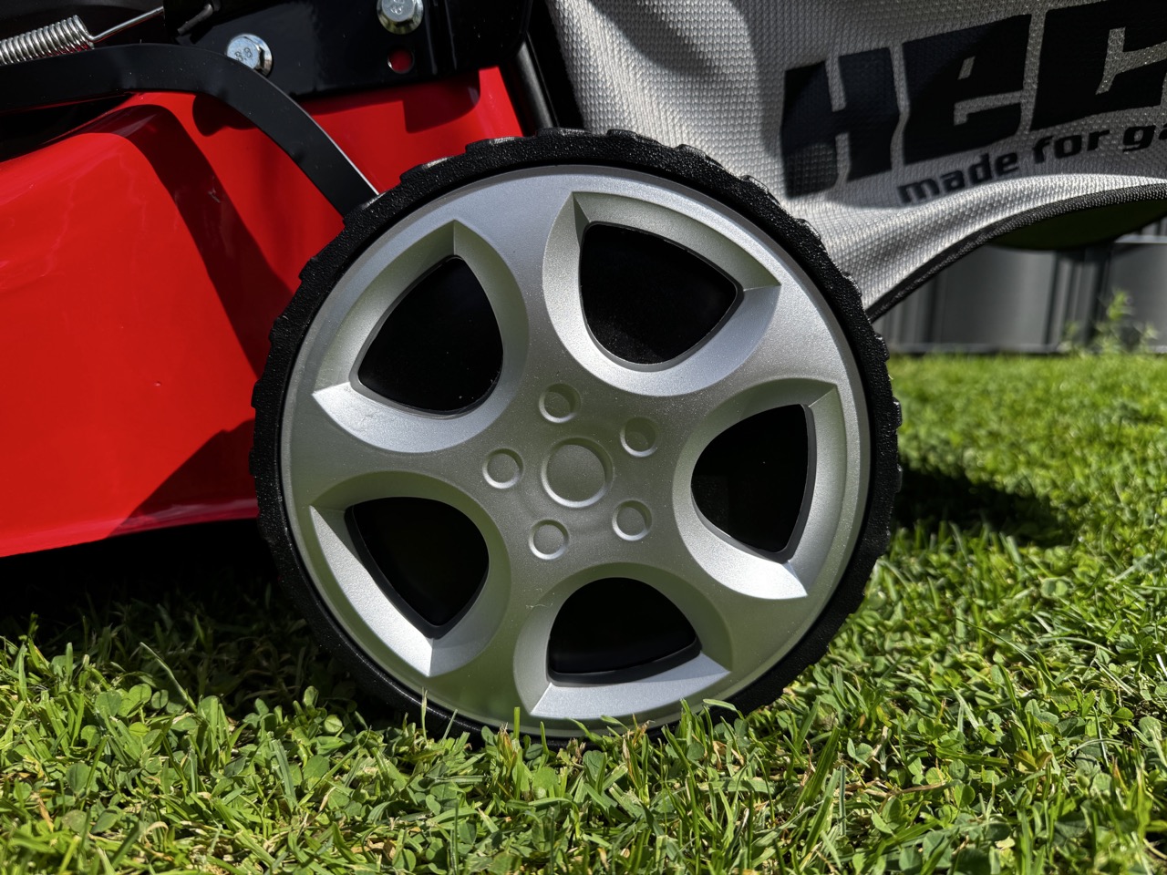 Der integrierte Radantrieb bewegt den Mäher mit etwa 3,5 Kilometern pro Stunde vorwärts. Besonders bei größeren Flächen reduziert das den Kraftaufwand. Allerdings lässt sich die Geschwindigkeit nicht regulieren – Nutzerinnen und Nutzer können den Antrieb nur ein- oder ausschalten. In Kurven oder kleineren Gärten erweist sich das als Nachteil. Hier ist uns der Mäher zu schnell unterwegs. Wir würden uns eine mehrstufigere Regulierung wie bei anderen Herstellern wünschen.