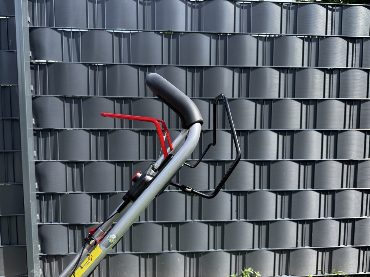 Die Verarbeitung ist insgesamt gut: Alle Bauteile passen relativ sauber zusammen, scharfe Kanten oder Gussfehler sind nicht vorhanden. Auch die Spaltmaße fallen gering aus. Der Mäher misst etwa 142 Zentimeter in der Länge, 50 Zentimeter in der Breite und 98 Zentimeter in der Höhe. Mit rund 21,3 Kilogramm gehört das Modell zu den leichteren seiner Klasse und lässt sich gut handhaben.