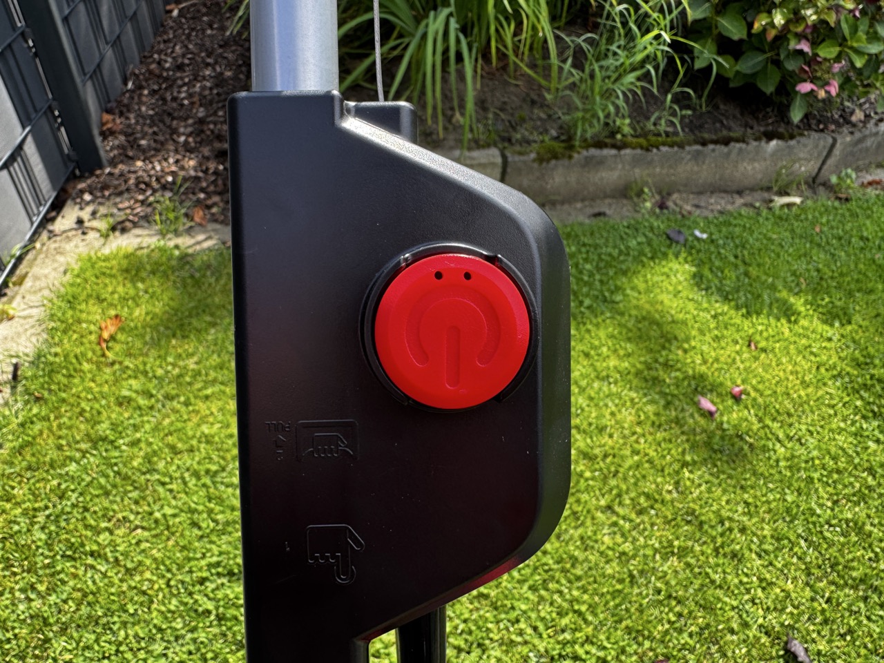 Der Führungsholm ist gummiert und liegt angenehm in der Hand. Er lässt sich in drei Höhenstufen verstellen und passt sich verschiedenen Körpergrößen gut an. Das Starten des 5041S funktioniert einfach und sicher: Ein Knopfdruck in Kombination mit dem Startgriff genügt. Eine Einschaltsperre verhindert unbeabsichtigtes Starten. Startgriff und Einschalttaste muss man immer zusammen schalten – sehr gut.