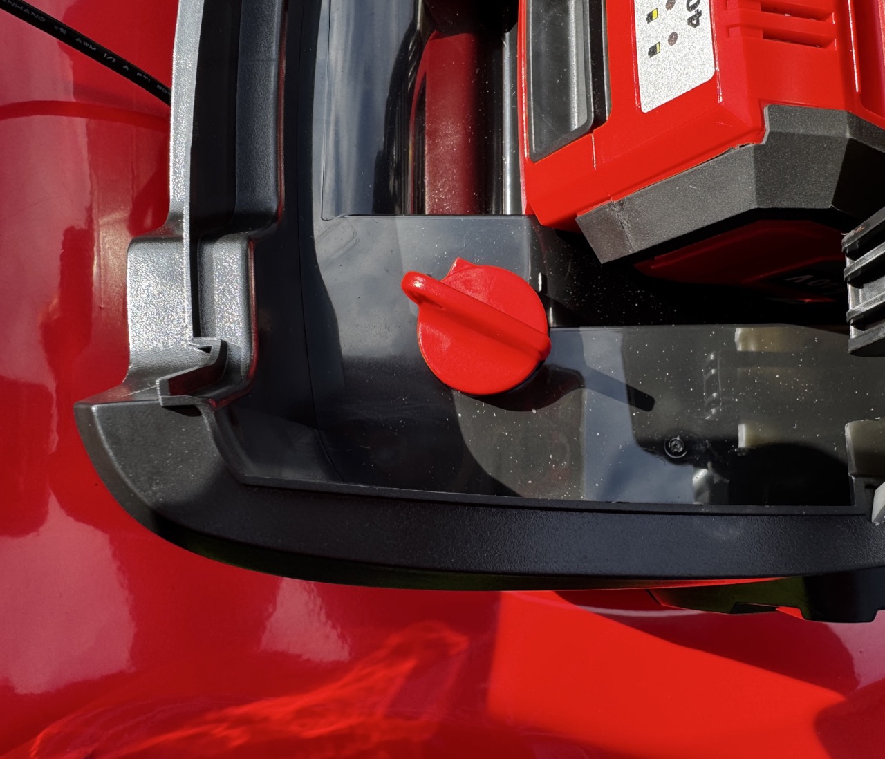 Der 40-Volt-Akku sitzt sicher im Fach – allerdings lässt sich der Akkustand während des Mähens nicht ablesen. (Foto: Testsieger.de)