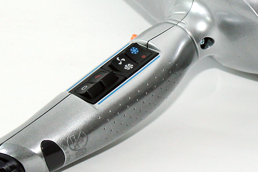 Der BaByliss Pro Digital 6000E punktet durch ein extrem langes Stromkabel – 2,6 Meter sorgen für eine ausgezeichnete Flexibilität. Auch an der restlichen Handhabung haben wir nichts auszusetzen. Der Haartrockner liegt gut in der Hand und ist mit einem Gewicht von 435 Gramm auch nicht zu schwer. Dadurch werden auch längere Styling-Sessions nicht zur Belastungsprobe für Geduld und Arme. Die Bedienung geht ebenfalls einfach von der Hand und ist nahezu selbsterklärend. Der BaByliss verfügt über vier Kippschalter, die sich allesamt an der Seite des Griffs befinden. Diese haben einen angenehmen Druckpunkt und einen leichten Widerstand, damit der Nutzer die Tasten nicht versehentlich betätigt.