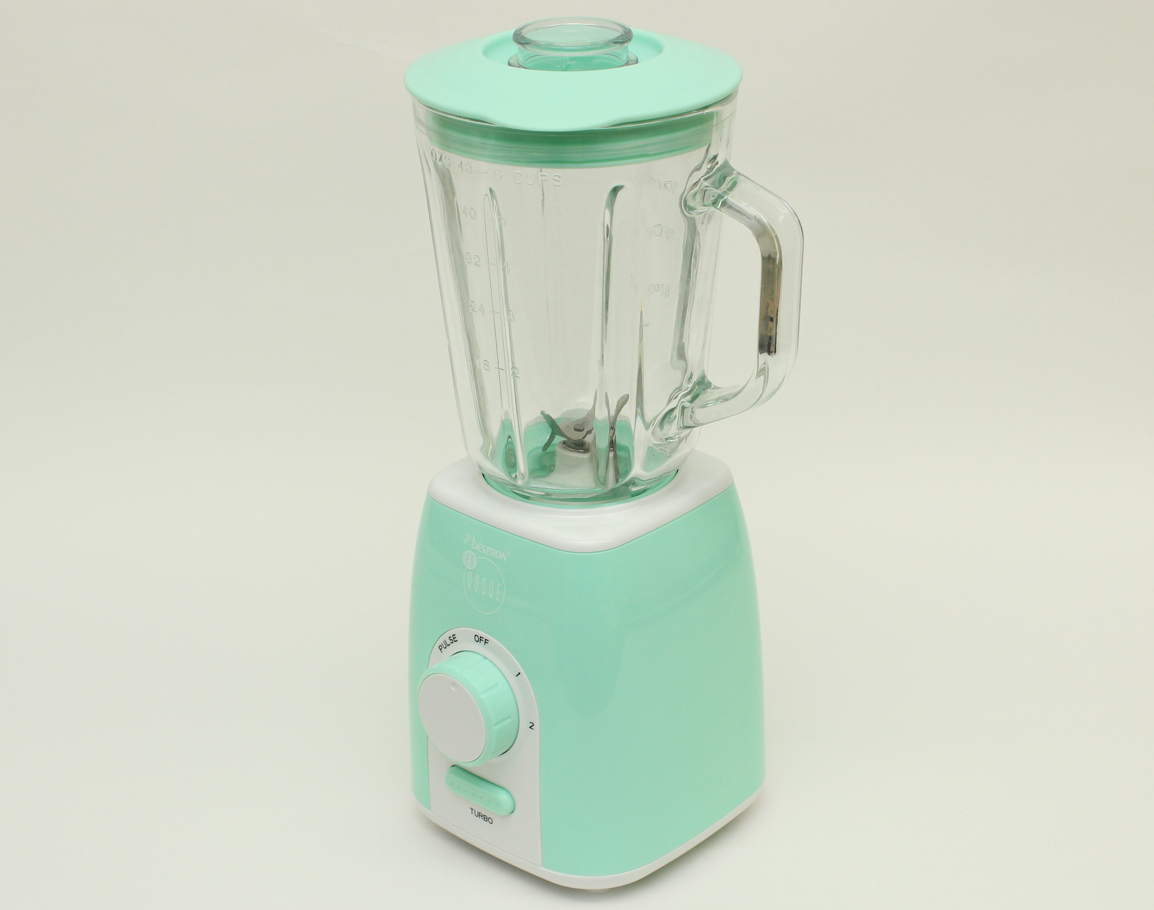 Bis auf die recht ungewöhnliche, mintgrüne Farbe ist das Design klassisch gehalten. Abgerundete Kanten verleihen dem Gehäuse des Mixers ein optisch ansprechendes Äußeres. Die Farbe ist jedoch natürlich Geschmackssache. Die Verarbeitungsqualität hinterlässt hingegen einen zwiegespaltenen Eindruck. Der Krug besteht aus robustem Glas und macht einen hochwertigen Eindruck. Das lässt sich vom Gehäuse der Motoreinheit nicht behaupten, hier dominiert Kunststoff. Trotz Hochglanz-Finish minimiert der hohe Plastikanteil den positiven Gesamteindruck etwas. Hier hat beispielsweise der WMF Coup Kompaktmixer die Nase vorne. Immerhin ist der verwendete Kunststoff robust und lässt sich nur unter enormen Kraftaufwand eindrücken. Ein weiterer Pluspunkt: Weder der Krug noch die Antriebseinheit sind anfällig für Fingerabdrücke.