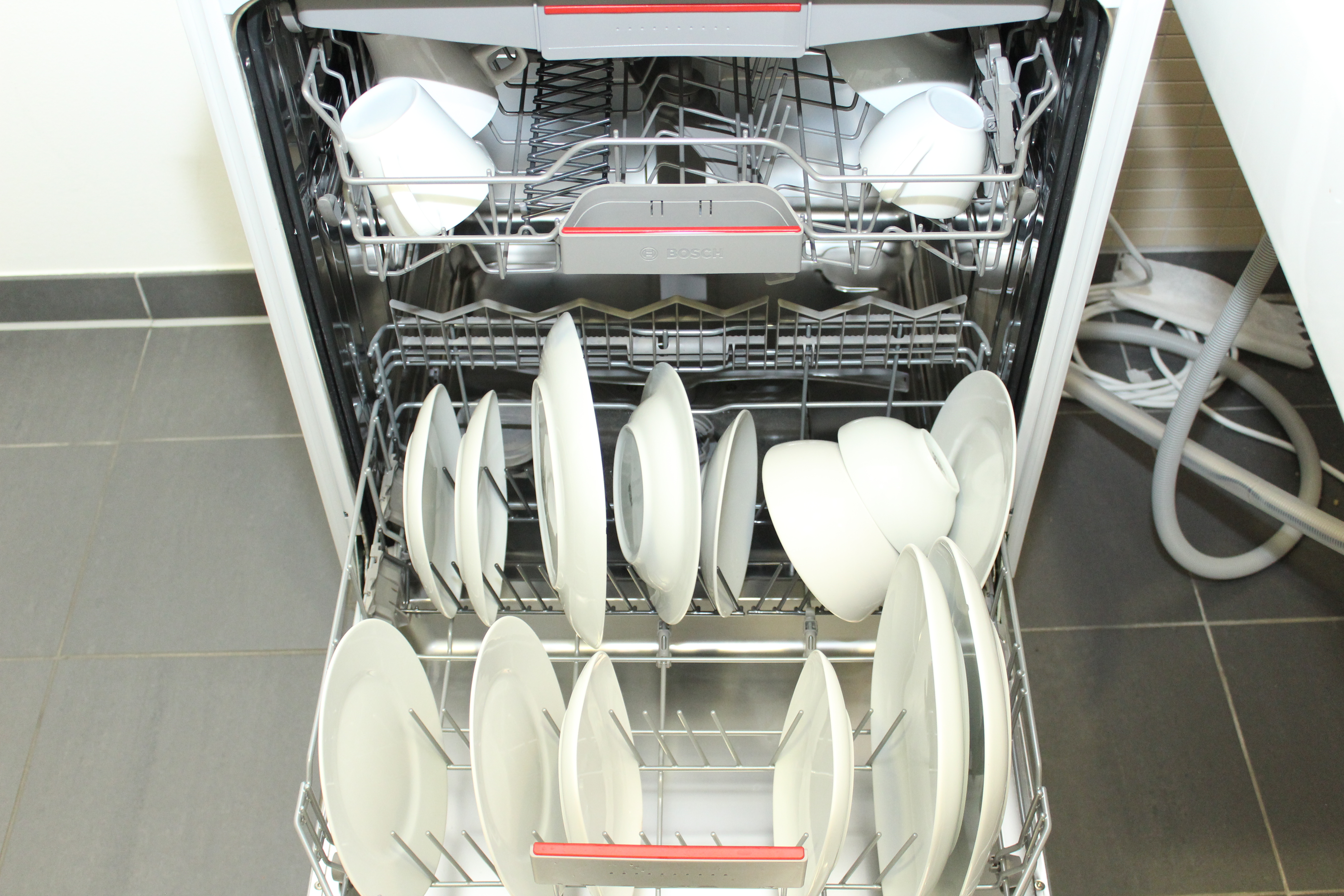 Für das Intensivprogramm verschmutzen wir Teller, Tassen und Besteck mit Ahornsirup, Nougatcreme, Ketchup und Honig und lassen das Geschirr über mehrere Tage eintrocknen. Hinzu kommen Töpfe mit eingebrannter Milch. Mit gemessenen 2:10 Stunden liegt die Programmdauer fünf Minuten unter der angegebenen Zeit. Hier macht sich der Beladungssensor bemerkbar, da wir den Bosch SMI68MS02E nicht komplett gefüllt haben. Das Ergebnis ist mehr als zufriedenstellend. Das gesamte Geschirr ist perfekt gereinigt und es lassen sich keine Rückstände mehr erkennen. Zudem sind Teller, Tassen und Besteck fast trocken – ein optimales Ergebnis. Der Stromverbrauch liegt mit 1,46 kWh im von Bosch angegebenen Bereich, genau wie der Wasserverbrauch von 13 Litern. Die Wärmeentwicklung in der Spülmaschine liegt direkt nach dem trocknen bei 51 Grad Celsius. Trotz der recht hohen Temperatur kann man das Geschirr gefahrlos anfassen.