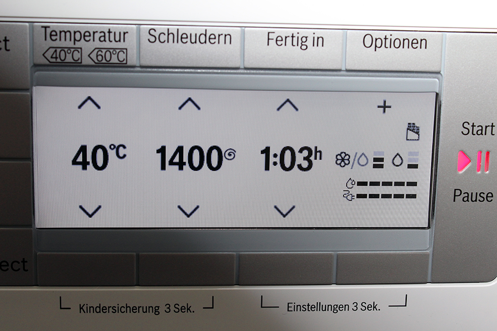 Das TFT-Display an der rechten Seite zeigt alle wichtigen Informationen wie Temperatur, Umdrehungszahl oder Restzeit an. Der Bildschirm stellt zwar nur schwarz-weiß dar, lässt sich aber auch noch aus größerer Distanz gut ablesen. Zudem erhält der Nutzer hier Informationen über den Wasser- und Stromverbrauch des gewählten Programms – allerdings nur in Form von fünf Balken. Damit hat man zwar einen groben Anhaltspunkt, wir hätten uns allerdings eine genauere Schätzung gewünscht. Der aktuelle Befüllungstand wird ebenfalls als Balken auf dem Display dargestellt.