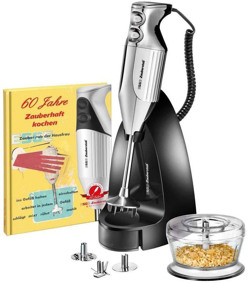 Bei einer Jubiläums-Edition will sich ESGE nicht lumpen lassen und hat dem Stabmixer viel Zubehör spendiert. Im Lieferumfang befinden sich ein Zerkleinerer, eine Schlagscheibe, eine Quirlscheibe und ein Multimesser. Alle Komponenten lassen sich an der sogenannten Zauberbasis an- beziehungsweise unterbringen. Außerdem können sich Käufer über ein Jubiläums-Kochbuch freuen. Hier sind Rezepte aus den letzten 60 Jahren zusammengefasst, die perfekt für den Zauberstab® geeignet sind. Die Bandbreite reicht von kaltem Hund über Pizza bis zu Muffins und Cupcakes – eine nette Dreingabe.