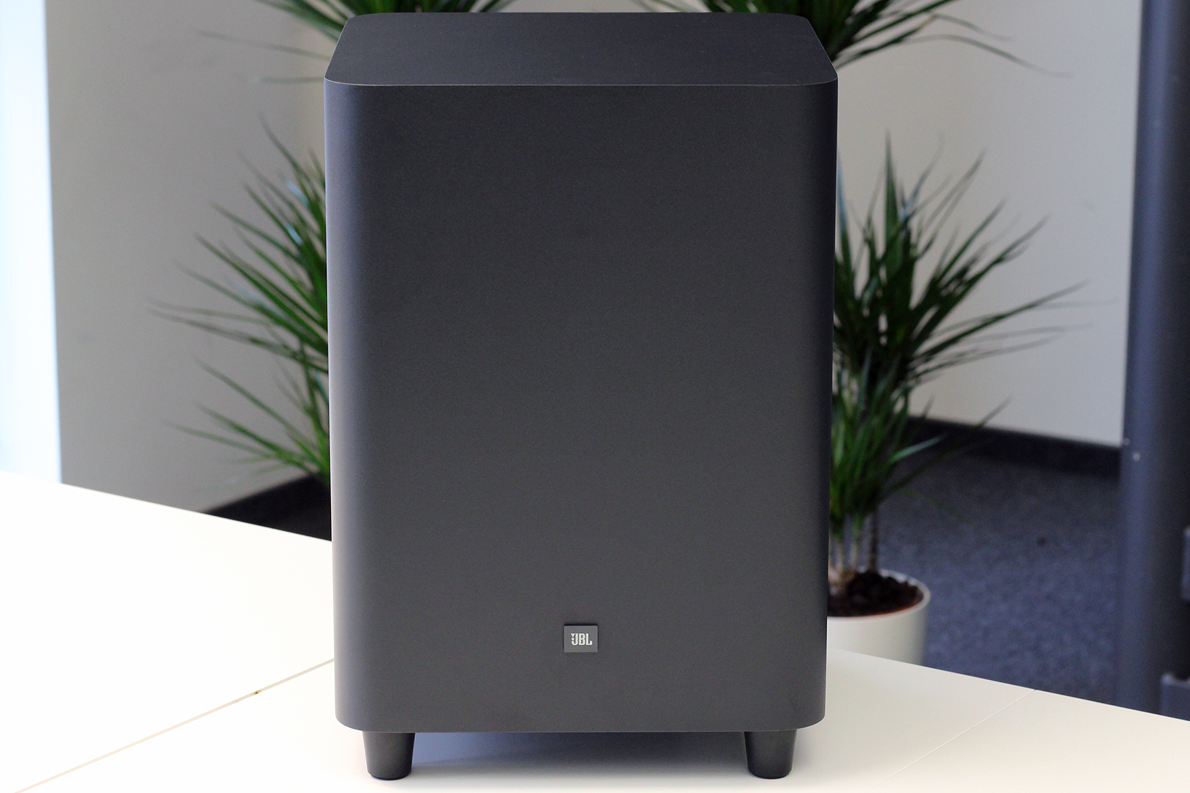 Während die Soundbar also mit eher kompakten Abmessungen glänzt, ist der beiliegende Subwoofer ein echter Brocken. Mit 12,1 Kilogramm bringt er ordentlich Gewicht auf die Waage und die Abmessungen von 30,5 x 30,5 x 44 Zentimetern in Breite, Höhe und Tiefe sind auch nicht gerade zurückhaltend. Damit setzt JBL ein echtes Statement und schürt hohe Erwartungen in Sachen Basswiedergabe. In puncto Design setzt sich das zurückhaltende Äußere allerdings fort. Der Tieftöner ist ebenfalls durchgängig in mattschwarzer Optik gehalten und macht einen wertigen Gesamteindruck. Vier Standfüße garantieren in Kombination mit dem hohen Eigengewicht einen sicheren Stand.