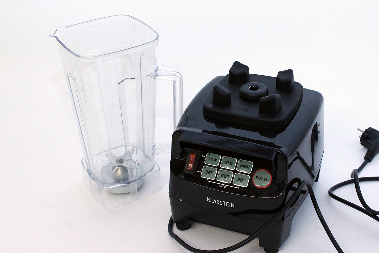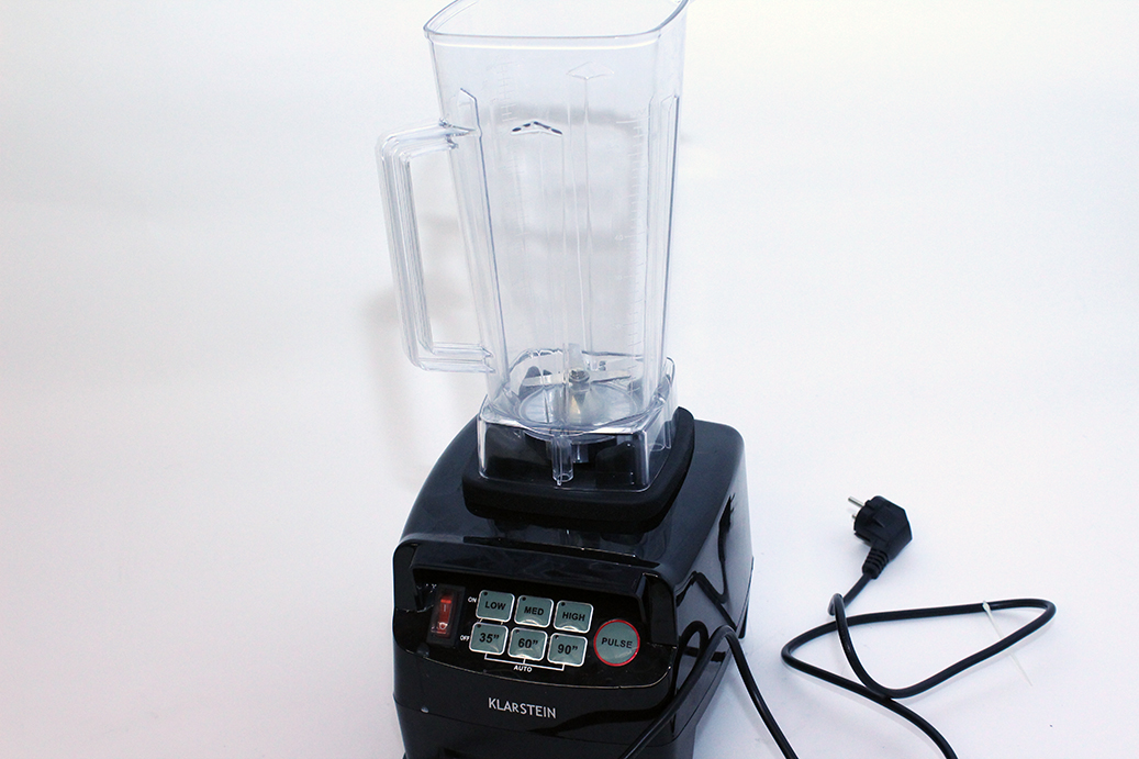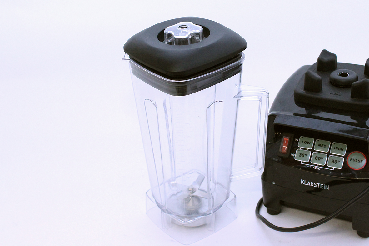 Das Einfüllen der Lebensmittel in den voluminösen 2-Liter-Krug gestaltet sich durch die große Öffnung sehr einfach. Dank einer Milliliter-Maßanzeige funktioniert die Zubereitung nach Rezept ebenfalls wunderbar. Über eine kleine Öffnung im Deckel lassen sich noch Lebensmittel nachfüllen. Um die Lebensmittel während des Mixvorgangs bei Bedarf noch einmal umrühren zu können, verfügt der Klarstein über einen 20 Zentimeter langen Stopfstab. Ein großer Nachteil ist jedoch, dass der Krug einfach nur auf die Basis gestellt wird und nicht fest einrastet. Er steht so locker, dass er selbst bei leichteren Stößen bereits herunterfallen kann, was uns direkt zum zweiten Nachteil führt. Die Motoreinheit arbeitet auch weiter, wenn das Gefäß nicht aufgesetzt ist. Wer mit dem Finger an den sich rasant drehenden Kunststoffring kommt, kann durchaus Verbrennungen oder Abschürfungen davon tragen.