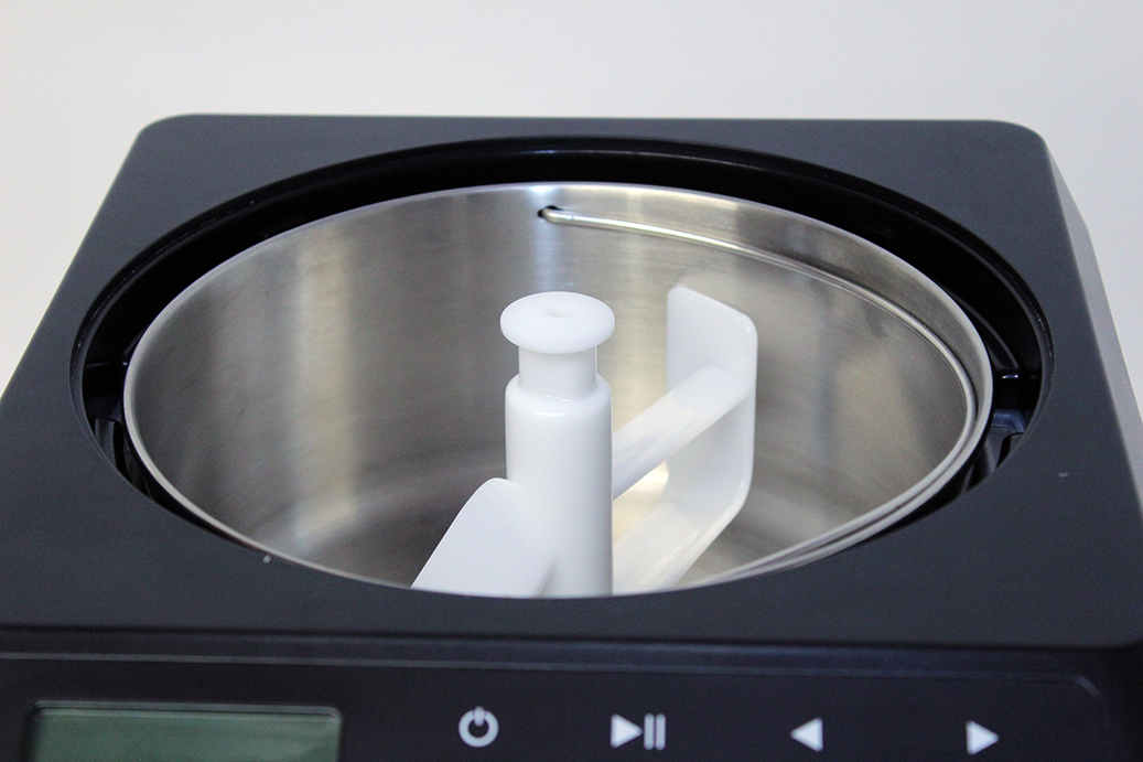 Bevor die Eismaschine loslegen kann, muss der Nutzer die Grundflüssigkeit herstellen. Dabei ist es wichtig, dass die Zutaten schon gut vermengt werden, bevor sie in die Maschine kommen. Die Vanilla Sky rührt das Eis zwar konstant um, allerdings ist sie nicht in der Lage, den Zucker aufzulösen. Sind die Vorbereitungen getroffen, können die gemixten Zutaten in den großen Edelstahl-Topf mit einem Volumen von zwei Litern gegossen werden. Dann noch die den Rührer einsetzen und die Eiszubereitung kann beginnen. Damit man einfach nach Rezept arbeiten kann, befindet sich ein 250-ml-Messbecher im Lieferumfang.