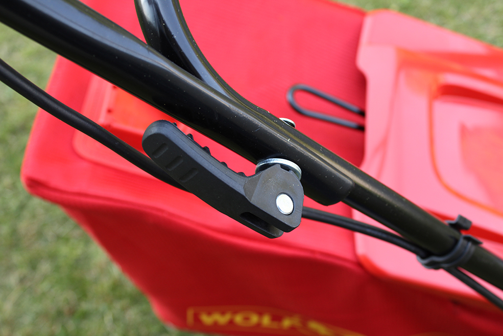 Die Vorder- und Hinterräder bestehen ebenfalls aus robustem Plastik und besitzen einen Durchmesser von 15 beziehungsweise 20 Zentimetern. Die vier Reifen sind sehr leichtgängig und damit die Grundlage für eine komfortable Handhabung. Damit auch längere Mäheinsätze nicht zur Belastungsprobe für die Hände ausarten, ist der Haltegriff bequem gepolstert. Einschalten lässt sich der Wolf Garten über die gängige Kombination aus Startknopf und Sicherheitsbügel. Die Komponenten müssen gleichzeitig gehalten werden, damit der Rasenmäher seinen Dienst aufnimmt. Sobald der Bügel wieder losgelassen wird, stoppt das Gerät.