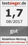 Der Wolf Garten 72V Li-ION Power 37 ist ein guter Akku-Rasenmäher. Das Gerät überzeugt vor allem in seiner Kerndisziplin und liefert ein sauberes, gleichmäßiges Schnittergebnis – auch bei hohem oder nassem Gras. Eine einfache Handhabung kann der Rasenmäher ebenfalls auf der Habenseite für sich verbuchen. Das Gleiche gilt für die großzügig bemessene Akkulaufzeit von etwa 35 Minuten und die kurze Ladezeit von circa einer Stunde. Allerdings hätten wir uns einen größeren Fangsack und einen etwas leiseren Betrieb gewünscht.