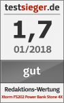 Die Xtorm FS202 Power Bank Stone 4X ist eine gute Powerbank mit einer hohen Kapazität von 10.000 mAh, von der in der Praxis etwa 8.700 mAh zur Verfügung stehen. Zudem ist sie ordentlich verarbeitet und äußerst robust. Praktischerweise verfügt die Xtorm über eine LED-Akkustandsanzeige und einen Power-Button, der allerdings hin und wieder nicht reagiert. Über die beiden USB-Ausgänge mit einer maximalen Stromstärke von 2,4 Ampere lassen sich problemlos zwei Smartphones parallel laden. Das Ladekabel ist mit 30 Zentimetern sehr knapp bemessen. Wer eine leistungsfähige Powerbank sucht und das etwas hohe Gewicht von 230 Gramm nicht als störend empfindet, macht mit der Xtorm FS202 nichts falsch.