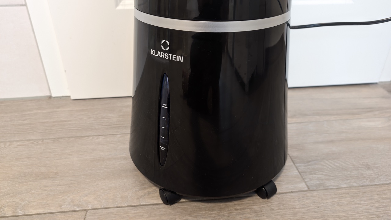 Der Klarstein Skyscraper Ice Smart macht seinem Namen alle Ehre. Mit einer Höhe von knapp 94,5 cm und einem Durchmesser von rund 28 cm wirkt das Gerät wie ein eleganter Turm. Das zylindrische Design mit den deutlich geschwungenen Seitenwänden wirkt modern und unaufdringlich. In der klassischen Farbkombination Schwarz und Silber sollte sich das Gerät harmonisch in viele Wohnräume einfügen. Trotz der Höhe bleibt der Luftkühler dank seiner Bodenrollen gut beweglich und wirkt keinesfalls wuchtig. Das Gewicht geht mit 6 Kilogramm ebenfalls noch in Ordnung. Im Zweifel lässt sich der Klarstein also auch noch gut in die nächste Etage tragen.
