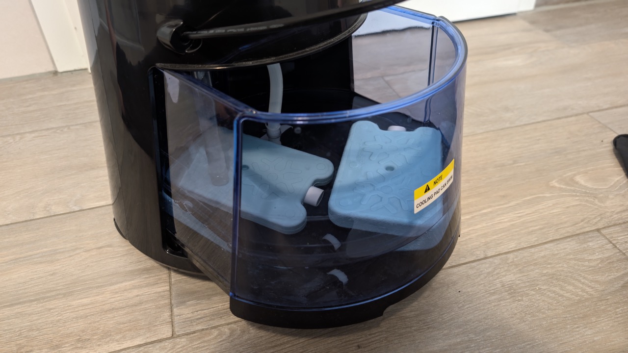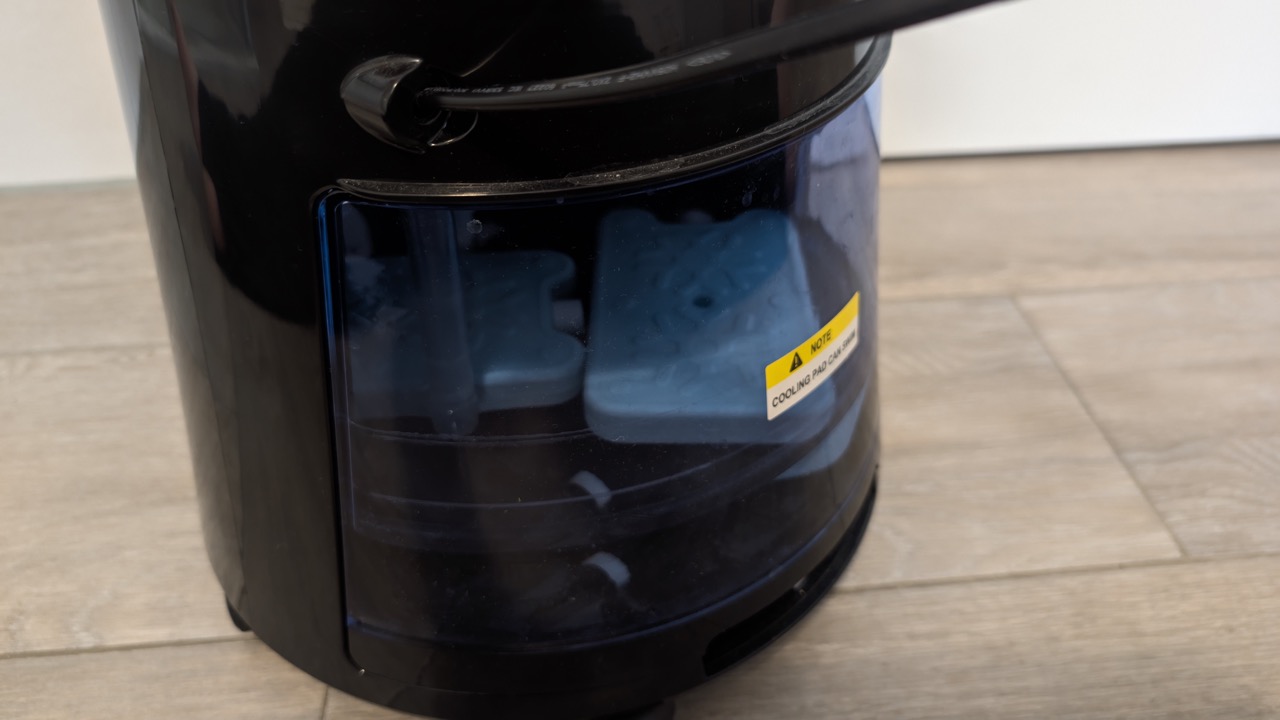 Besonders effektiv arbeitet das Gerät in Kombination mit den zwei mitgelieferten Kühlakkus, die vor dem Einsatz idealerweise für mindestens 24 Stunden im Gefrierfach gelagert werden sollten. Wir messen an einem heißen Sommertag aus einem Meter Entfernung zum Gerät eine Abkühlung der Temperatur von 0,5 Grad Celsius.