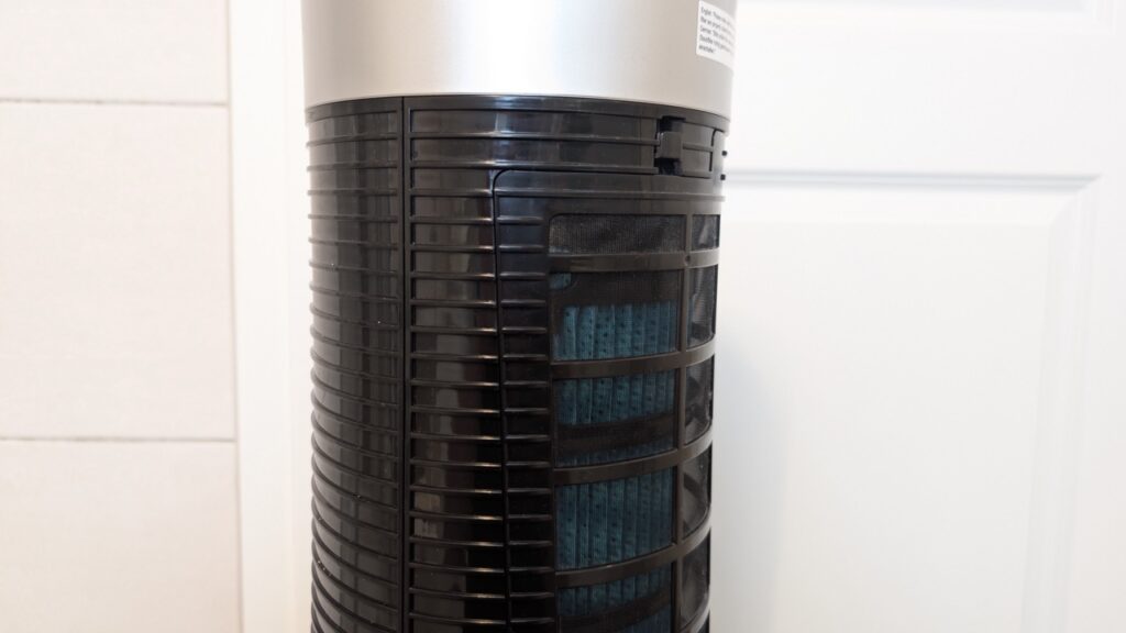 Zur Reinigung des Verdunstungspads auf der Rückseite müssen wir zunächst den Staubschutzfilter lösen – was mit etwas Übung gelingt. Das Entnehmen und Reinigen des Pads (idealerweise monatlich mit Spülmittel) ist möglich, aber etwas fummelig. Die Konstruktion hätte an dieser Stelle benutzerfreundlicher ausfallen können.