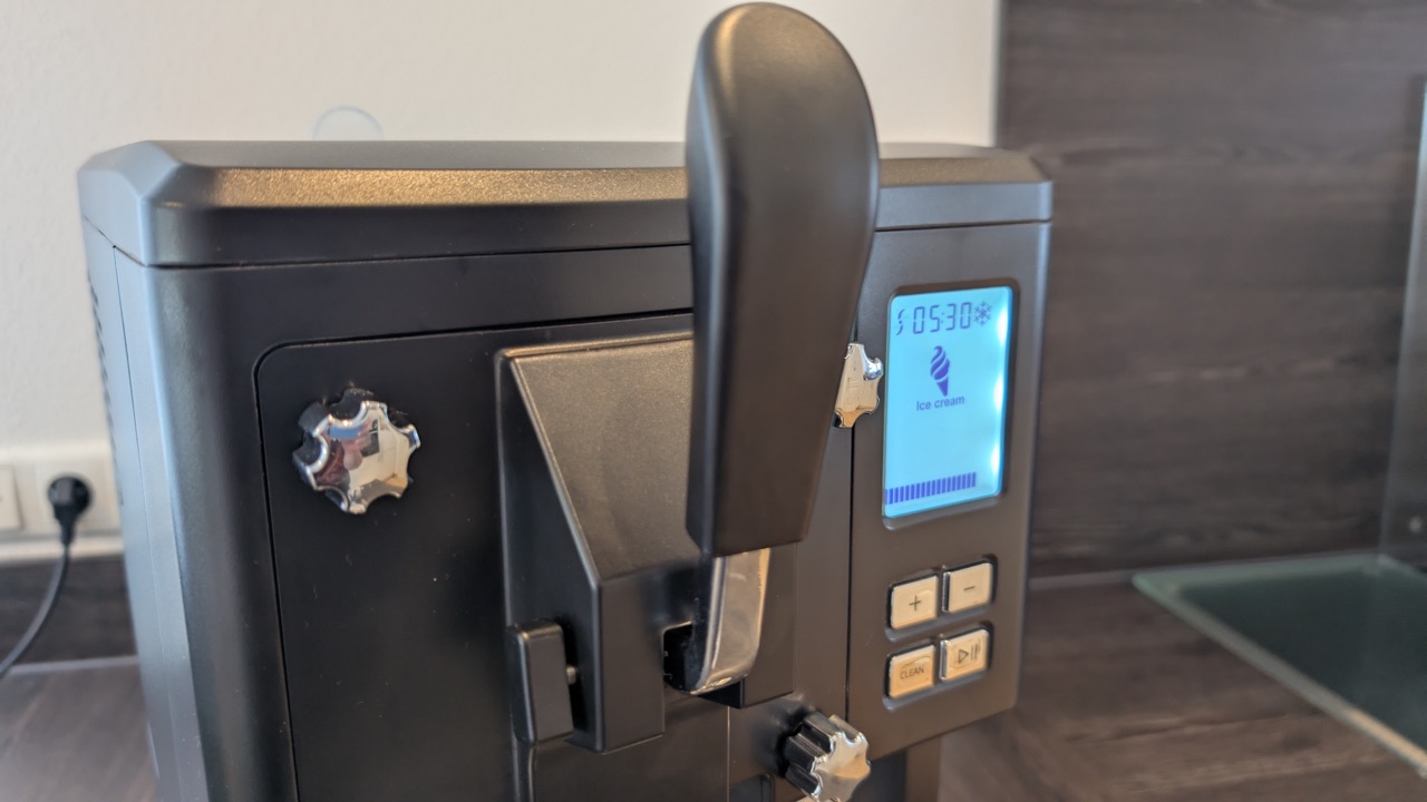 Das Eis überzeugt durch eine cremige Konsistenz und erinnert stark an Softeis aus der Eisdiele. Allerdings erfordert die Wahl der Zubereitungszeit etwas Feingefühl. Bei der Standardangabe von 50 Minuten bleibt das Eis zwar cremig, beginnt jedoch schnell zu schmelzen. Verlängert man die Zeit, wird es fester, allerdings verbleiben dann Rückstände im Behälter, die sich über den Ausguss nicht mehr vollständig entnehmen lassen. Nutzerinnen und Nutzer müssen sich daher ein wenig mit der Maschine vertraut machen, um die perfekte Balance zu finden. Ihnen muss allerdings auch klar sein, dass immer etwas Eis zurückbleibt.