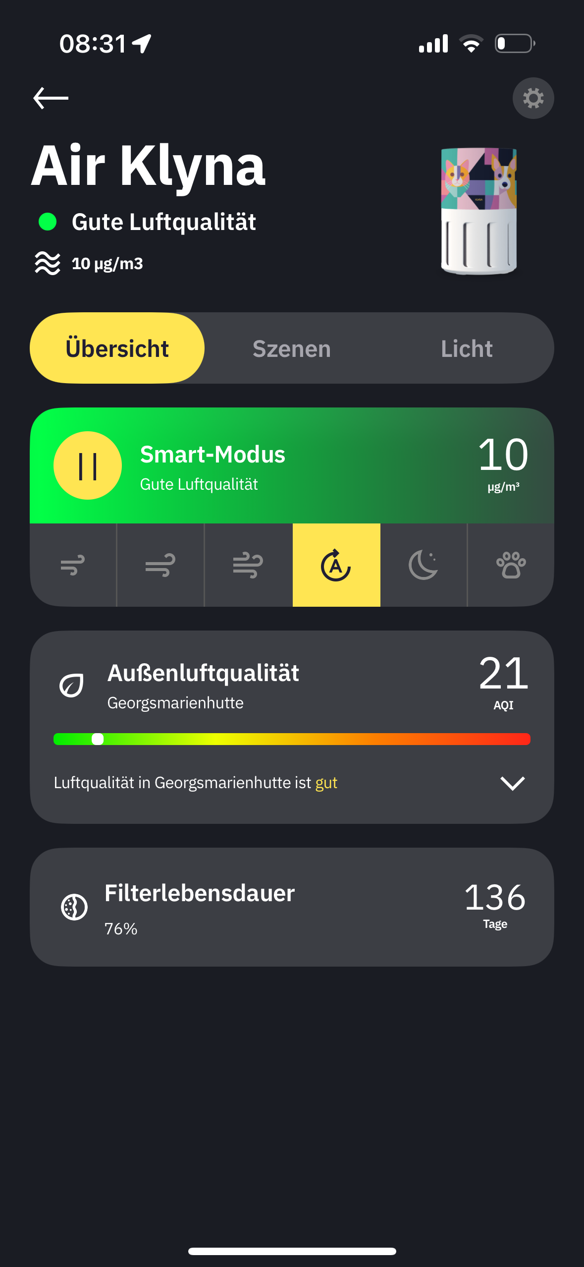 Die App Klyqa, kostenlos für iOS und Android, bietet zusätzlichen Komfort. Sie zeigt nicht nur die Luftqualität (innen und außen) in Mikrogramm pro Kubikmeter an, sondern erlaubt auch die Steuerung aus der Ferne. Das ist etwa dann praktisch, wenn Haustiere tagsüber allein zu Hause sind. Zudem ist der Klyqa über Sprachassistenten wie Siri und Alexa steuerbar – in unserem Test funktioniert das zuverlässig, auch wenn es kein unbedingt notwendiges Feature ist.