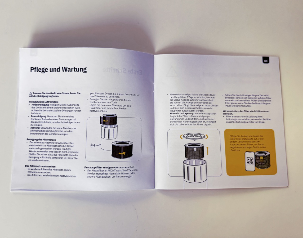Der Klyqa kommt komplett vormontiert bei uns an. Ein manuelles Einsetzen des Filters entfällt. Das vereinfacht die Inbetriebnahme deutlich. Der grundlegende Aufbau ist selbsterklärend – eine Anleitung ist zunächst nicht notwendig. Komplexer wird es allerdings bei der Kopplung mit der App. Diese funktioniert bei uns nicht auf Anhieb. Warum es beim ersten Mal nicht funktioniert hat, können wir nicht sagen. Die Anleitung bietet hierzu keine große Hilfe.
