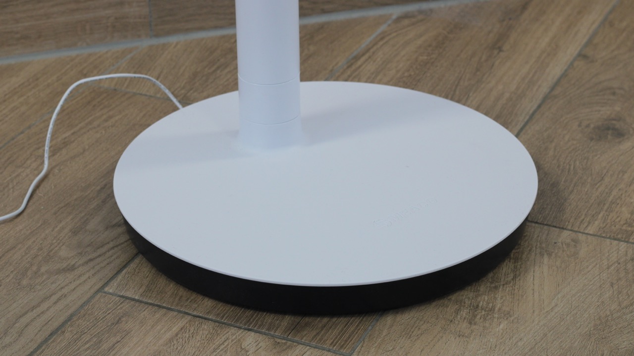Die Rotoreinheit hat eine Breite von circa 30,5 Zentimetern und eine Tiefe von 21,5 Zentimetern. Die Höhe können wir flexibel anpassen: In der kleinstmöglichen Aufstellvariante als (recht wuchtiger) Tischventilator misst er etwa 60 Zentimetern, mit zwei zusätzlichen Stangenelemente von je 25 Zentimetern ist er jedoch auf 85 oder sogar 110 Zentimeter erweiterbar. Der Standfuß hat einen Durchmesser von 34 Zentimetern. Die Motoreinheit wiegt 2,5 Kilogramm. Ein kleiner Wermutstropfen ist das 160 Zentimeter lange Netzkabel, das für unseren Geschmack einen Tick länger sein könnte.