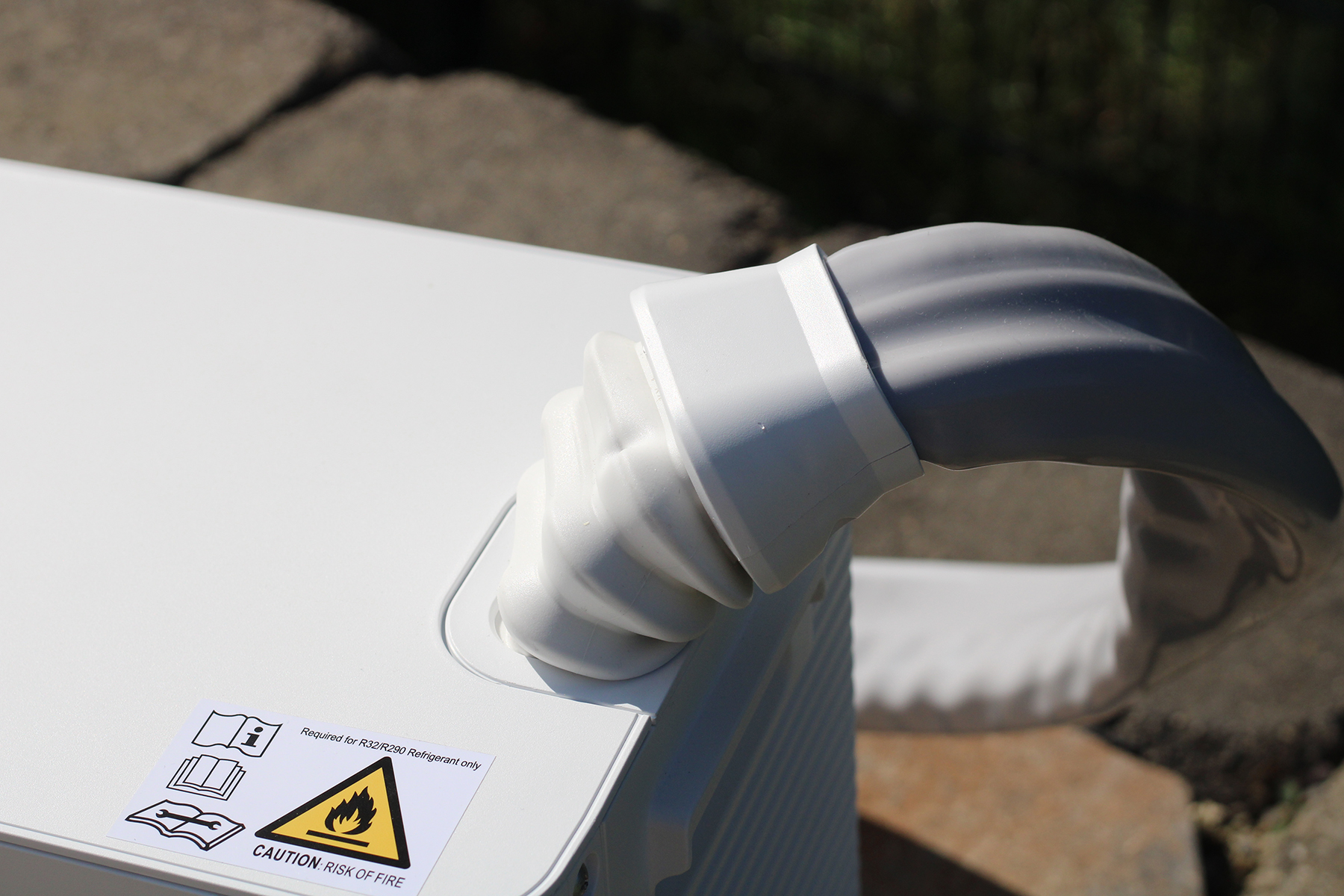 Die Verarbeitung der Midea PortaSplit gefällt uns sehr gut. Der verwendete Kunststoff wirkt wertig. Zwar lässt er sich bei Außen- und Inneneinheit an den Seitenwänden etwas eindrücken, ein noch festeres Material hätte das Gewicht aber noch weiter nach oben geschraubt. Alles in allem schützt das Gehäuse das empfindliche Innere gut. Laut dem Hersteller müssen Nutzerinnen und Nutzer die Außeneinheit auch bei Regen nicht unbedingt hereinholen. Das können wir im Praxistest bestätigen. Einen Regenschauer übersteht die PortaSplit problemlos. Der Kälteschlauch ist mit einer dicken Gummiummantelung versehen, die ebenfalls einen hochwertigen Eindruck macht. Sehr schön: Die Verbindungsstellen an Innen- und Außeneinheit sind leicht flexibel, was Beschädigungen bei der Installation vorbeugt.