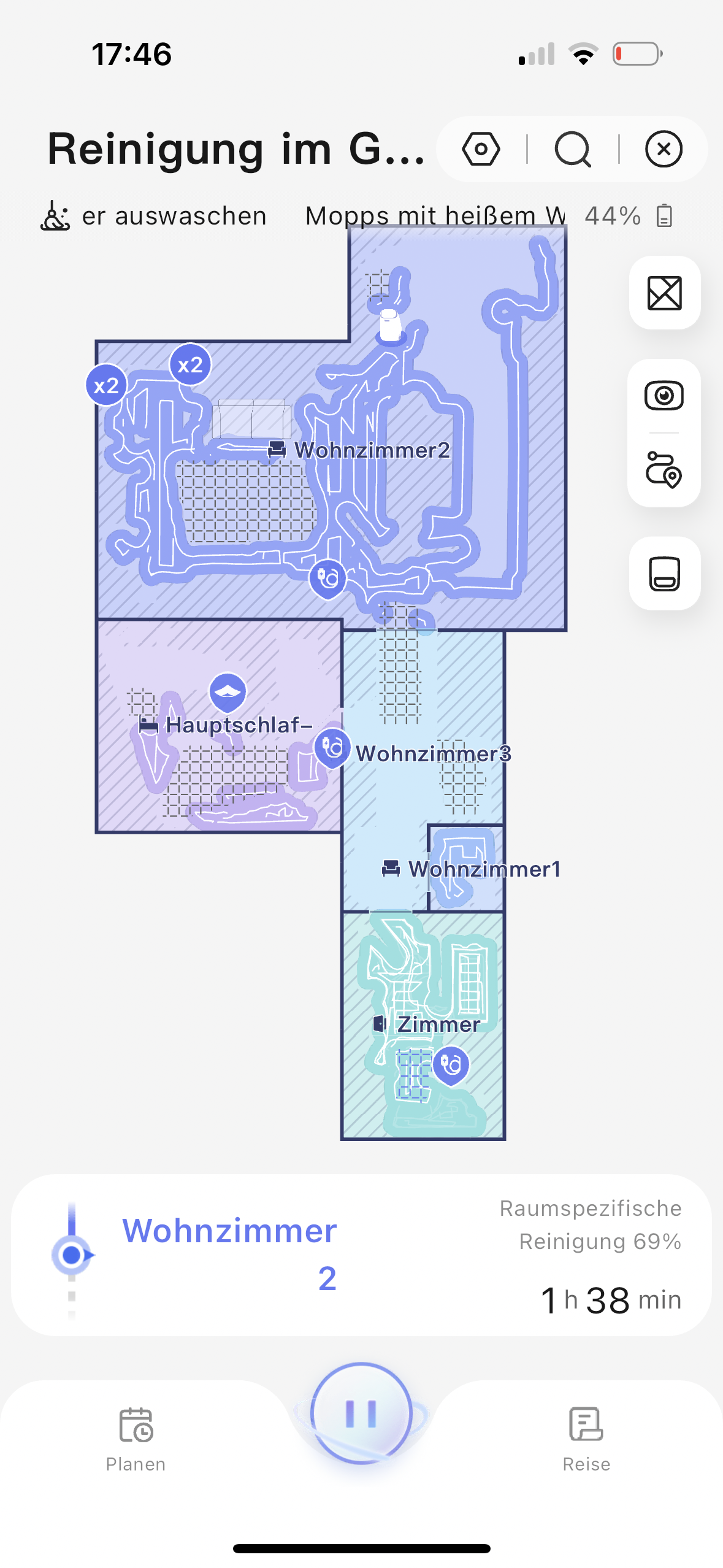 Bereits nach rund 15 Minuten liegt eine präzise Karte der Wohnung vor – das ist schnell und effizient. Die Navigation erfolgt durch eine Kombination aus LDS, Dual-Kamera und einer speziell trainierten KI-Kamera, die zahlreiche Objekte erkennt. Das Reinigungsmuster ist systematisch und effizient, allerdings lässt der Roboter vereinzelt Bereiche aus, etwa hinter einem hochflorigen Teppich.