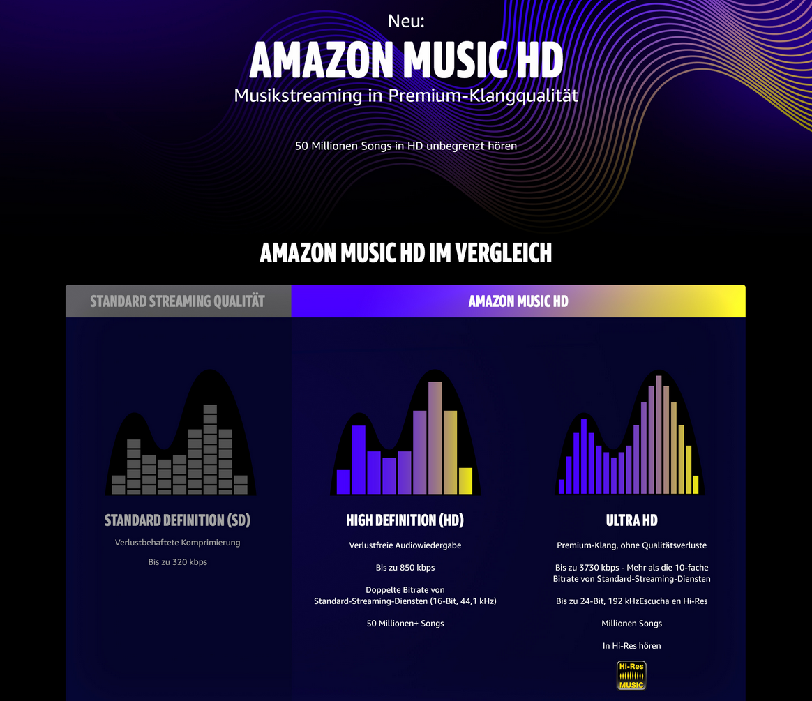 Der Dienst ist ab sofort in verschiedenen Preisstaffelungen erhältlich. Prime-Mitglieder bezahlen 12,99 Euro im Monat, Kunden ohne Prime-Mitgliedschaft 14,99 Euro. Wer bereits Amazon Music Unlimited bezieht, kann sein Abo für zusätzliche fünf Euro im Monat auf Music HD umstellen lassen.
