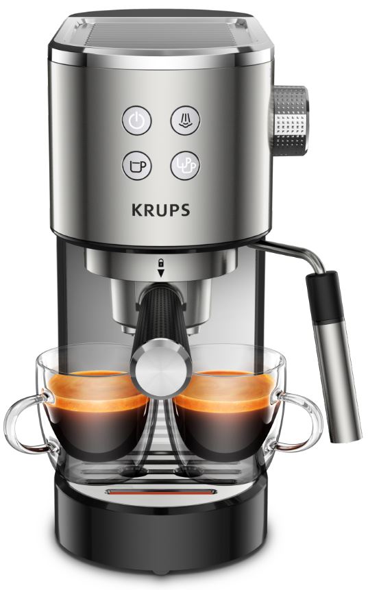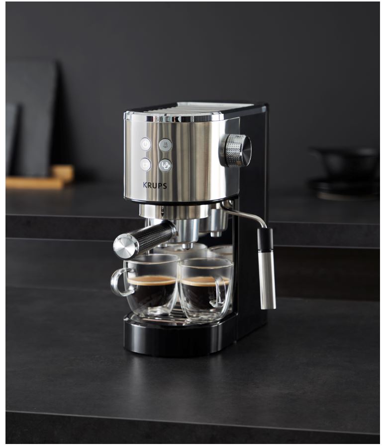 Die Krups Espressomaschine Virtuoso (XP442C) ist ab April 2021 für eine unverbindliche Preisempfehlung von 219,99 Euro erhältlich. Im Lieferumfang befinden sich noch ein Dosierlöffel und ein Tamper.