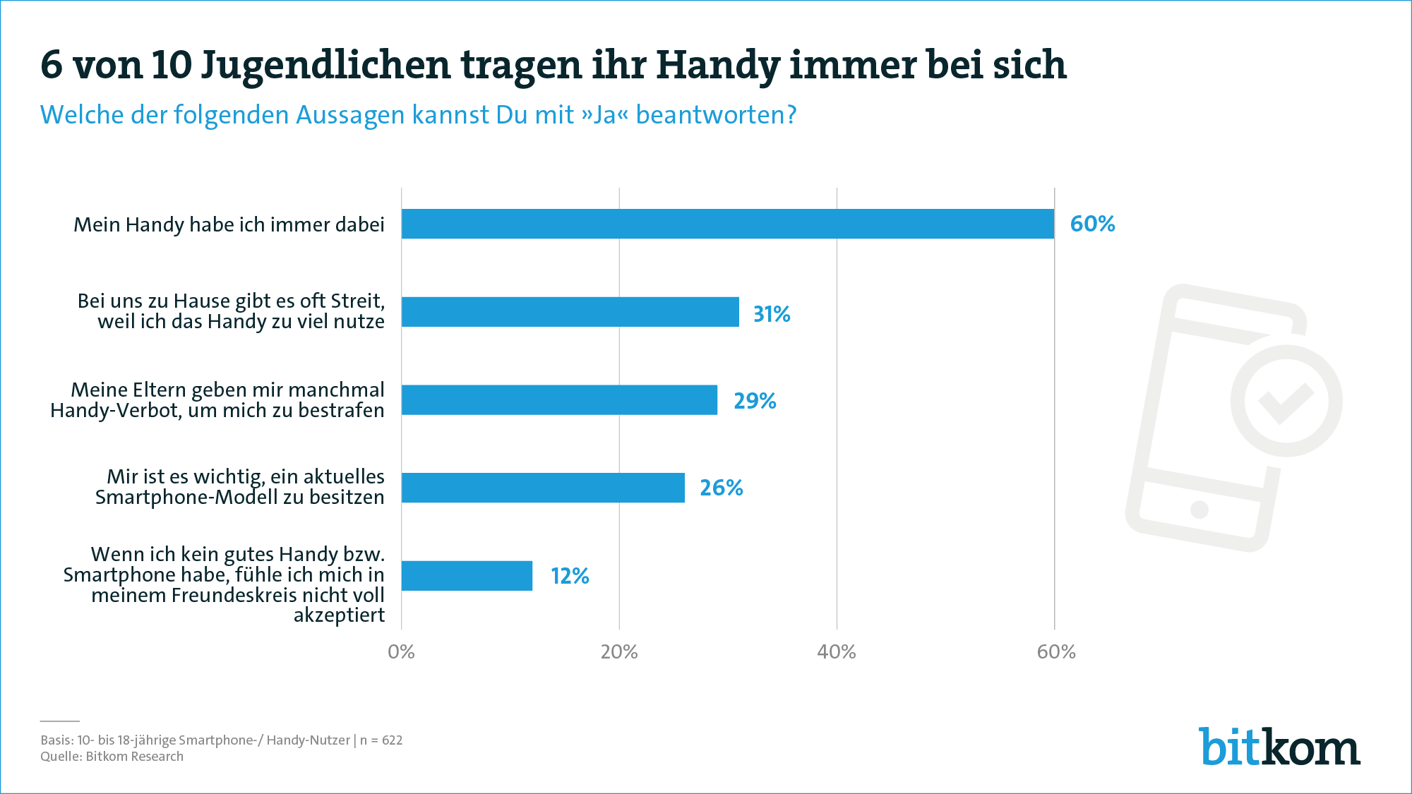 Jeder Dritte berichtet von Konflikten wegen zu ausgiebiger Handynutzung. Bei 29 Prozent der Befragten sprachen die Eltern sogar ein zeitweises Smartphone-Verbot aus. Bitkom-Präsident Achim Berg empfiehlt einen Kompromiss: Jugendliche könnten einen verantwortungsvollen Umgang mit den Geräten nur erlernen, wenn sie diese auch verwenden dürften. Dennoch sei es an den Eltern, bei der Nutzung hinsichtlich Zeit und Anwendungen Grenzen zu ziehen.