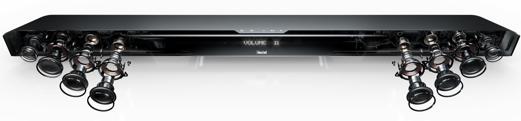 Laut Teufel bietet die Cinebar 11 eine verbesserte Leistungsfähigkeit und soll sich auch gut für größere Zimmer eignen. Im Gehäuse finden sich zwei 20-mm-Hochtöner und sechs 45-mm-Mitteltöner, die von acht digitale Endstufen angetrieben werden. Wer möchte kann die Soundbar auch mit den separat erhältlichen Rear-Speakern Teufel Effekt koppeln und damit echten Raumklang genießen. Aber auch die virtuelle Raumklangtechnologie Dynamore von Teufel ist mit von der Partie.