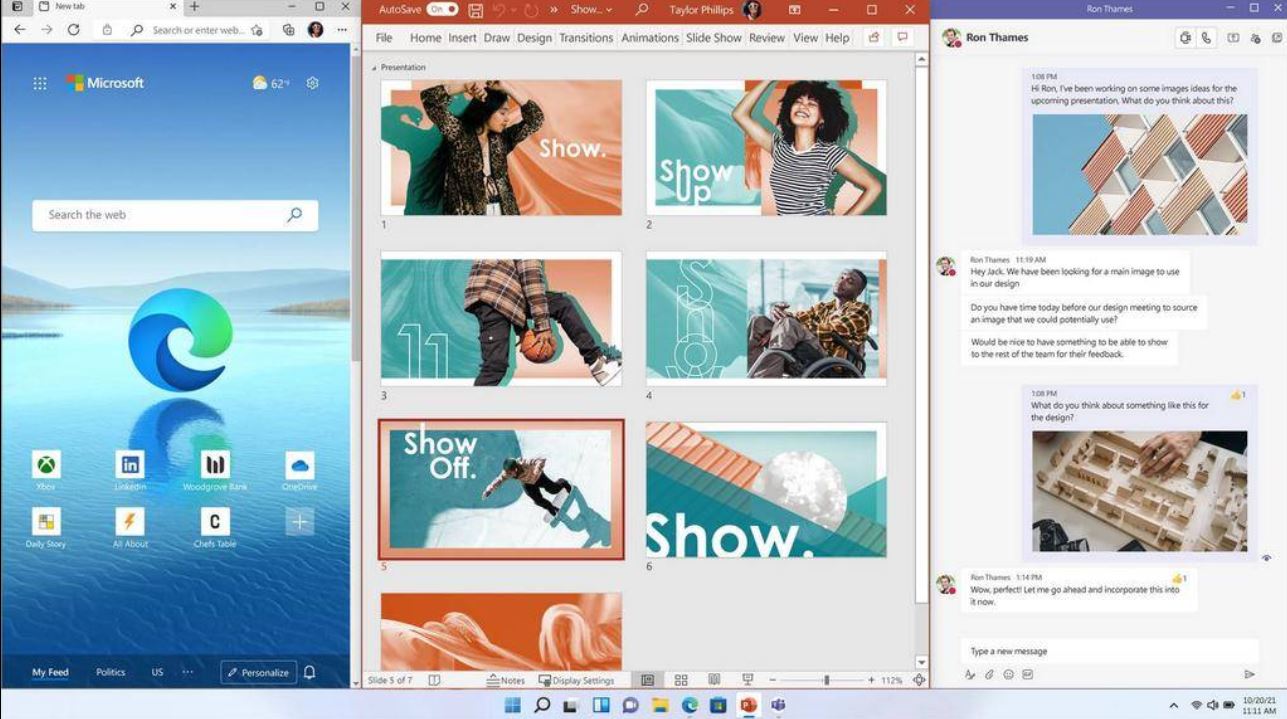 Snap Layout ist sicherlich eine der praktischsten neuen Funktionen von Windows 11 und dürfte das Arbeiten vieler Nutzerinnen und Nutzer erleichtern. Über die Funktion lassen sich verschiedene, häufig parallel verwendete Programme zu einer Gruppe verbinden. Die einzelnen Programmfenster werden dann aneinander angedockt und lassen sich gleichzeitig starten oder minimieren. Wer also häufig die gleichen Programme in einer bestimmten Anordnung benötigt, erhält hier die perfekte Möglichkeit. Das funktioniert auch über mehrere Monitore hinweg. Windows 11 erkennt automatisch, ob zwei Bildschirme angeschlossen sind und passt das Layout und die Anordnung dann dementsprechend an.