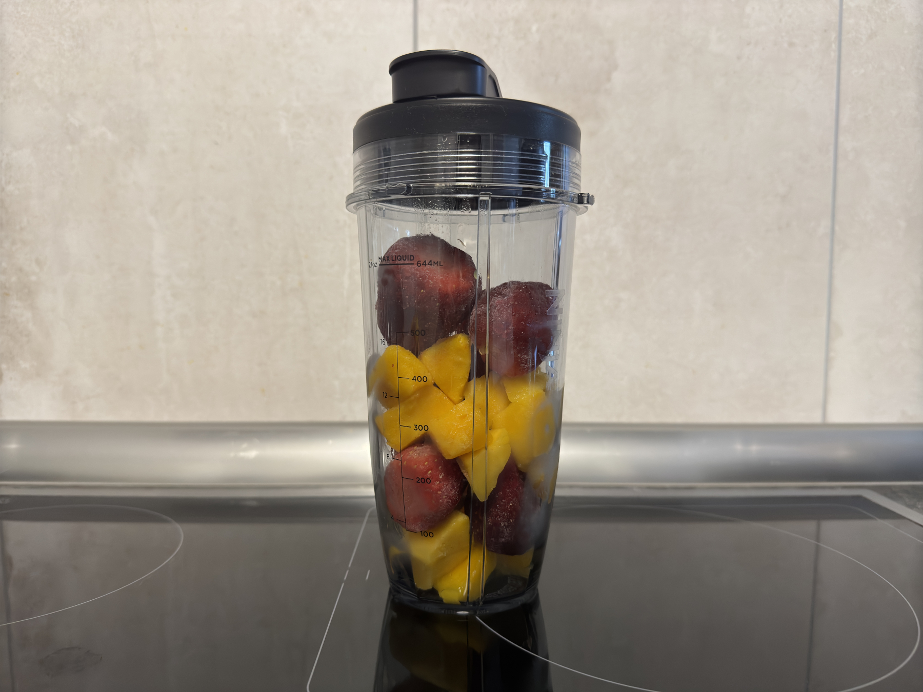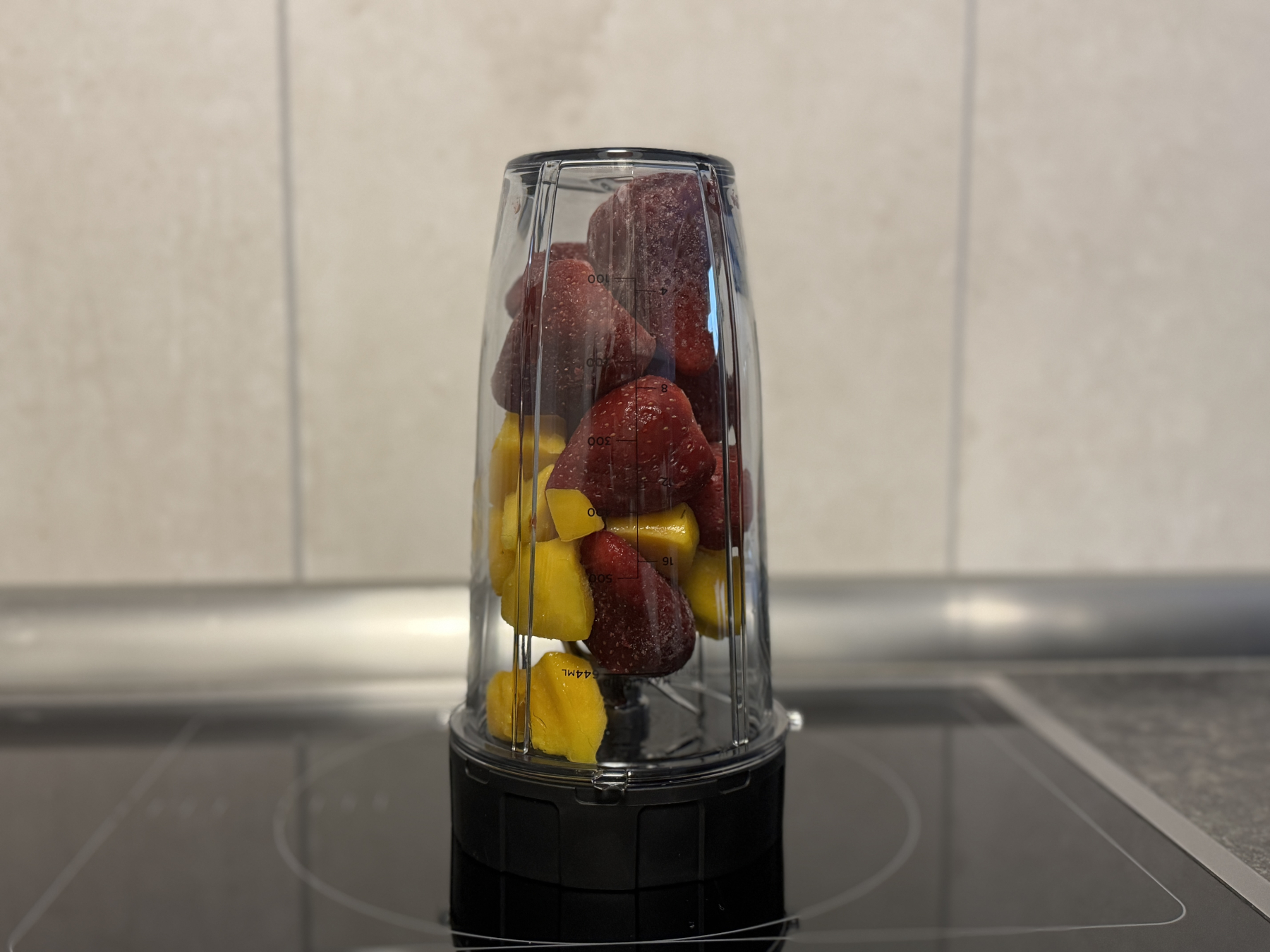 Unser zweiter Test verläuft jedoch deutlich besser. Wir bereiten ein Fruchtsorbet zu, indem wir 400 Gramm gefrorene Erdbeeren und Mangostücke sowie 100 Gramm Eiswürfel verwenden. Bereits nach dem ersten Durchgang im Automatik-Modus erhalten wir ein zufriedenstellendes Ergebnis. Das Sorbet ist cremig und locker. Auch wenn wir den Mixvorgang sicherheitshalber erneut starten, ist dies eigentlich nicht nötig. Hier überzeugt der Mixer auf ganzer Linie.