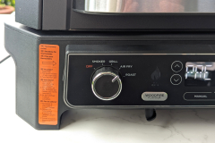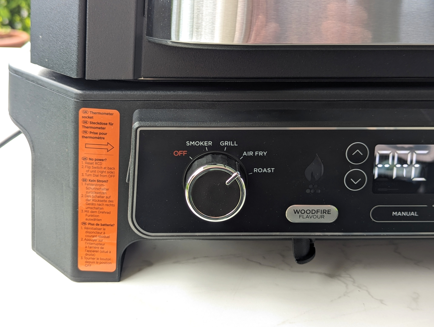 Ist der Grill eingeschaltet, leuchtet das gut integrierte Display auf. Über den Drehregler auf der linken Seite schalten wir den Grill ein und aus oder wählen das gewünschte Garprogramm. Zudem können Nutzerinnen und Nutzer hier die Temperatur auswählen. Allerdings nur in den 3 Stufen Low/Medium/High. Hier hätten wir uns eine etwas genauere Auswahl gewünscht. Die Woodfire-Taste fügt allen Gerichten das erwähnte Raucharoma hinzu. Im Lieferumfang liegen 2 Pellet-Proben bei, diesen sind jedoch nach jeweils 3 Zubereitungen verbraucht. Weitere Holzpellets gibt es beim Hersteller für knapp 15 Euro und sollen für 20 Vorgänge reichen. Wer die Smoker-Funktion regelmäßig nutzt, muss also Zusatzkosten in Kauf nehmen.