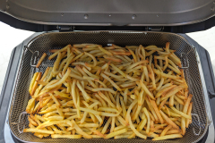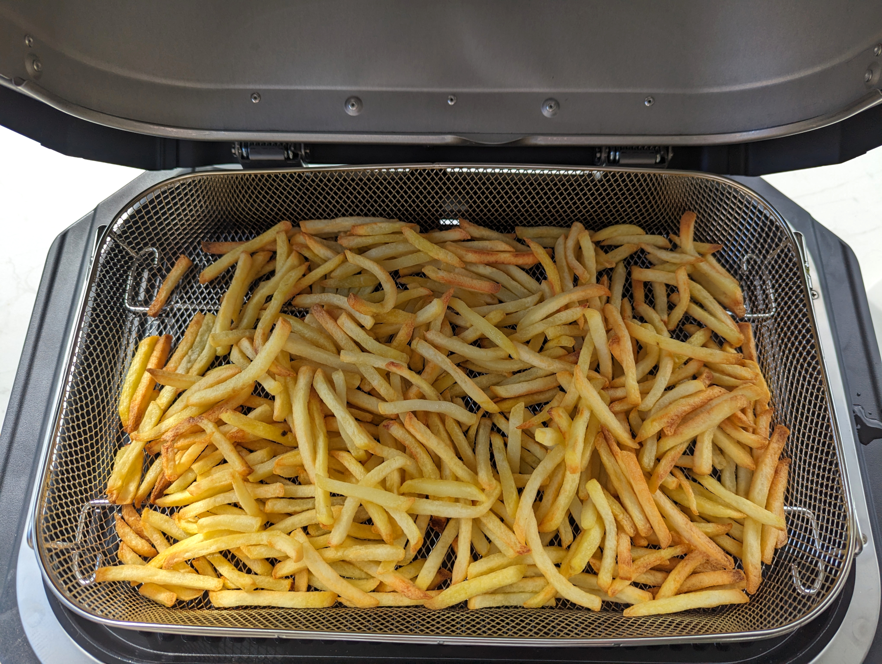 Im zweiten Test nutzen wir die Heißluft-Funktion. Dazu stellen wir den im Lieferumfang enthaltenen Gitterkorb auf den Grillrost und fügen 1 Kilogramm Pommes hinzu. Wer möchte, kann sogar bis zu 2 Kilogramm Pommes gleichzeitig zubereiten lassen. Das ist im Vergleich zu einer normalen Fritteuse viel und insbesondere bei einer größeren Anzahl an Gästen sehr hilfreich. Die Ergebnisse sind hingegen nur in Ordnung. Selbst nach 25 Minuten sind trotz mehrmaligen Wendens noch nicht alle Pommes durchgegart – sehr schade.