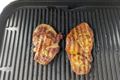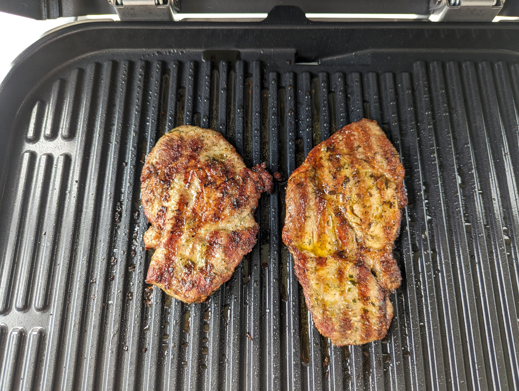 Für den ersten Durchgang nehmen wir Würstchen und klassisches Grillfleisch wie Hähnchenbrust und Nackensteak. Die Ergebnisse sind sehr gut. Das komplette Grillgut ist schnell gegart und bietet schöne Grillstreifen. Dies spricht für eine sehr gleichmäßige Hitzeverteilung in der Kuppel und übertrifft andere Elektrogrills.