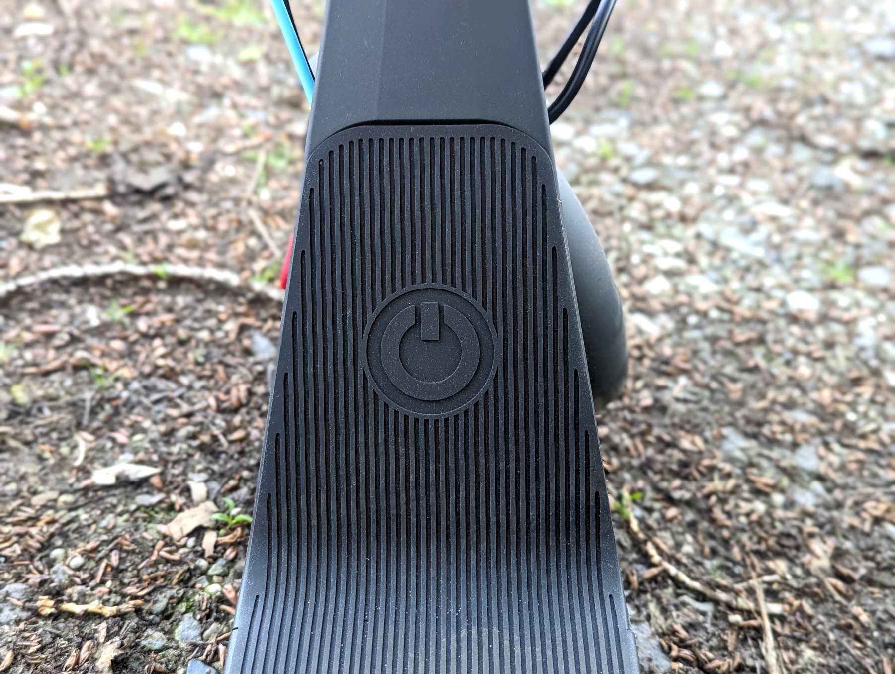 Das zentrale Bedienelement ist die Power-Taste unter dem Display. Durch einmaliges Drücken startet der Scooter. Bei zweimaliger Betätigung können wir die Leistungsstufe wechseln. Neben dem Fußgängermodus (Fußgänger-Symbol) gibt es noch den Standardmodus (D) sowie den Sportmodus (S). Die kleinste Stufe ermöglicht eine Maximalgeschwindigkeit von 6 Kilometern pro Stunde. Bei D ist die Maximalgeschwindigkeit auf 12 Kilometer pro Stunde begrenzt. Erst im Sportmodus stehen uns die vollen 20 Kilometer pro Stunde zur Verfügung.