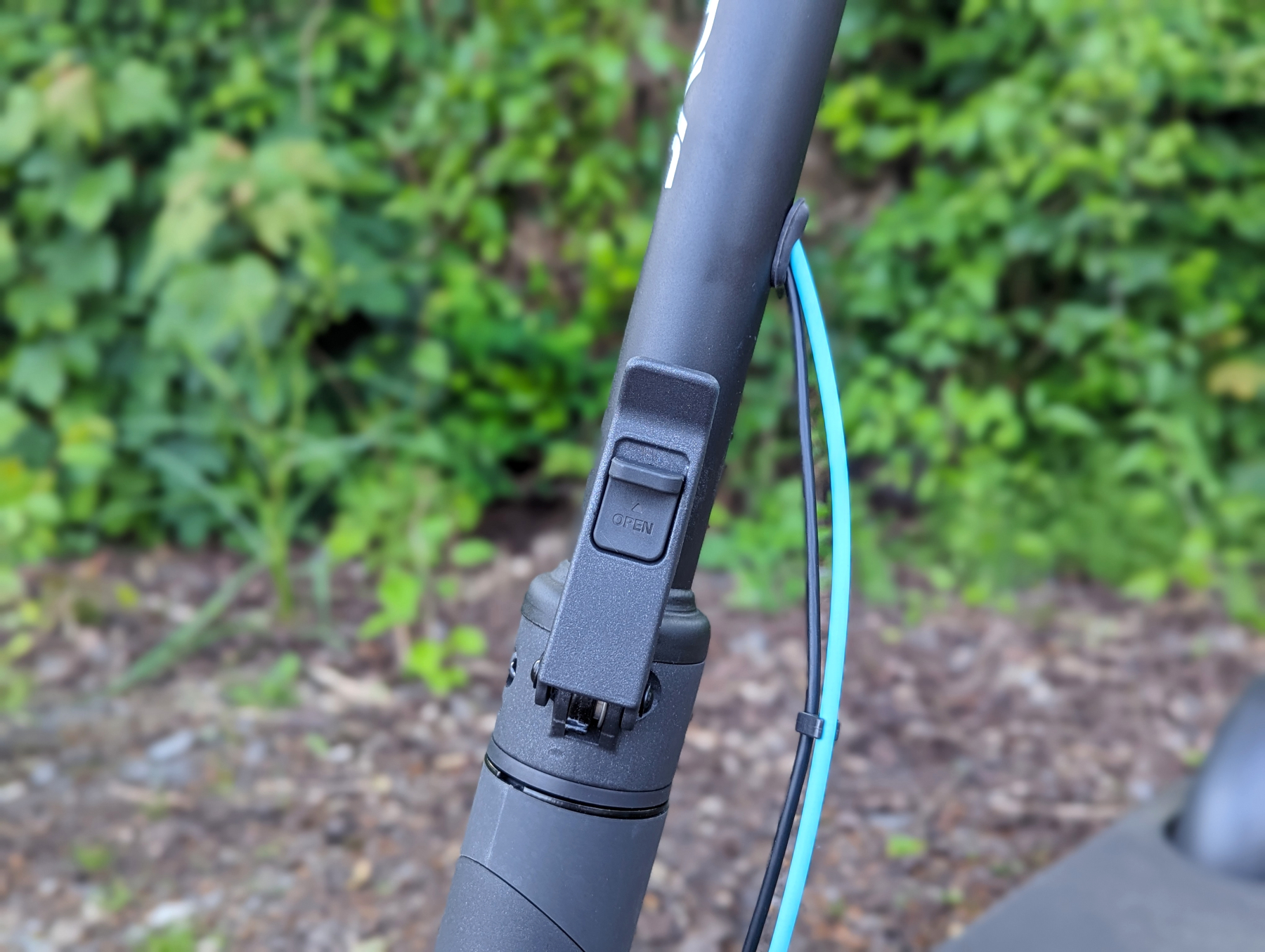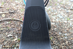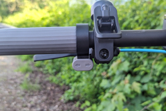 Links neben dem Display befindet sich die Klingel. Sie ist einfach zu erreichen und warnt andere Verkehrsteilnehmer zuverlässig. Ebenfalls auf der linken Seite sitzt der Bremshebel für die Trommelbremse am Hinterrad. Zur Fortbewegung müssen wir die Beschleunigungstaste auf der rechten Seite konstant drücken. Sie funktioniert zuverlässig, doch bereits nach 10 bis 15 Minuten spüren wir Ermüdungserscheinungen in den Fingern. Eine bessere Gummierung hätte den Komfort deutlich erhöht.