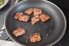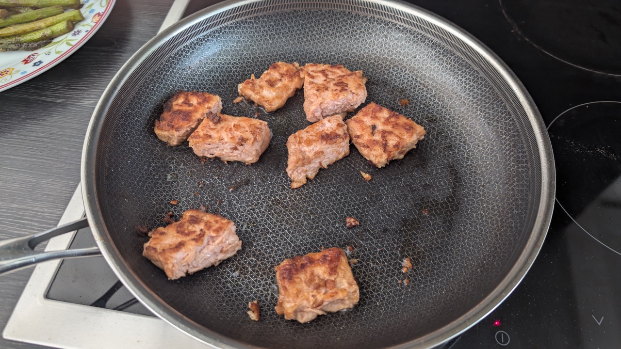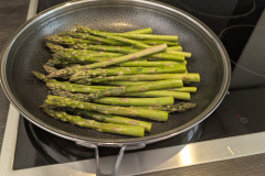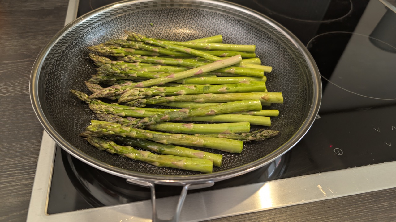Beim scharfen Anbraten von Fleisch zeigt die Pfanne ihre Stärken: Steaks und Hähnchenbrust bekommen eine schöne Bräunung und gelingen gleichmäßig. Auch Gemüse wie Spargel, Paprika, Zucchini oder Champignons brät schnell und zeigt ein gutes Röstbild. Die Hitzeverteilung ist insgesamt sehr gleichmäßig, sodass kein Hitzestau entsteht oder einzelne Stellen zu stark erhitzen.
