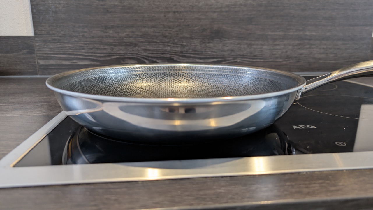 Die Verarbeitungsqualität hinterlässt im Test einen sehr guten Eindruck. Die Oberfläche fühlt sich hochwertig an und sieht ebenso aus. Scharfe Kanten oder unsauber gearbeitete Stellen suchen wir vergebens. Der Edelstahlgriff ist fest montiert und vermittelt beim Anfassen sofort Stabilität und Qualität. Wir testen die Variante mit 28 Zentimetern Durchmesser, Nutzerinnen und Nutzer können sich aber auch für 20, 24, 26 oder 30 Zentimeter entscheiden. Auch wenn die Onyx mit 1,2 Kilogramm nicht zu den leichtesten Pfannen zählt, punktet sie durch eine gute Balance. Diese sorgt für eine angenehme Handhabung, auch bei längerem Braten.